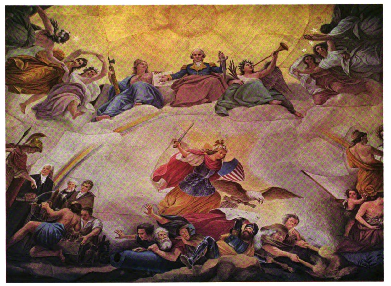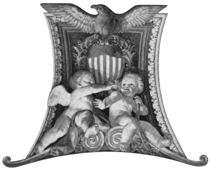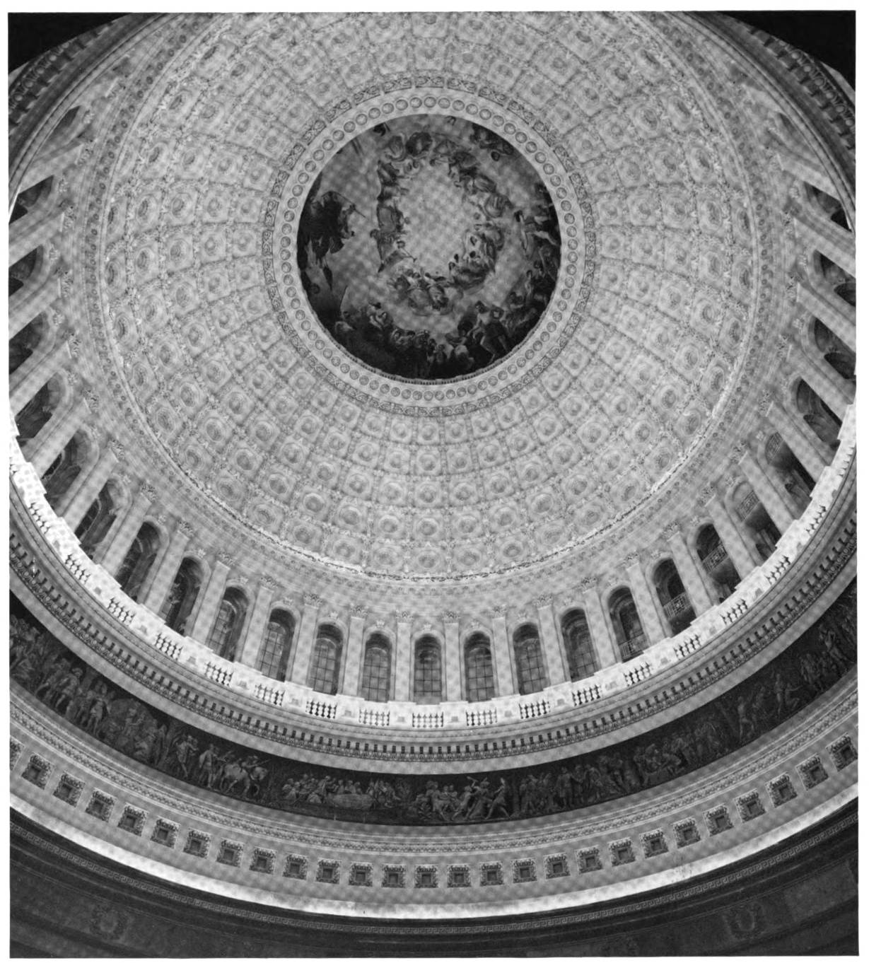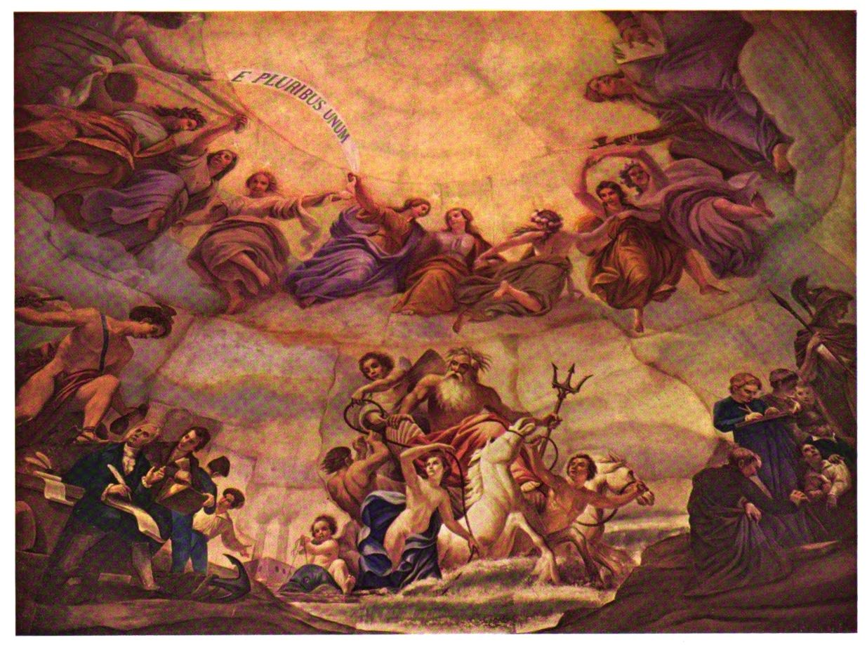 The early settler in North America had little opportunity for monumental painting. The austerity of religious belief dominating many new world settlements, infused as they were with the spirit of the Reformation, afforded meager encouragement to its development. American artists, following Benjamin West to England, leaned heavily upon British custom and precedent. West’s pupils—Charles Willson Peale, Gilbert Stuart and Joseph Wright—became makers of likenesses, and liberty-loving John Trumbull pursued historical painting to produce four of the eight great framed pictures of the Rotunda of the Capitol. Contrasted with Brumidi’s paintings, these mark the difference between the easel picture, a loosely related, detachable embellishment, and mural decoration designed in scale and color especially to enhance architecture.