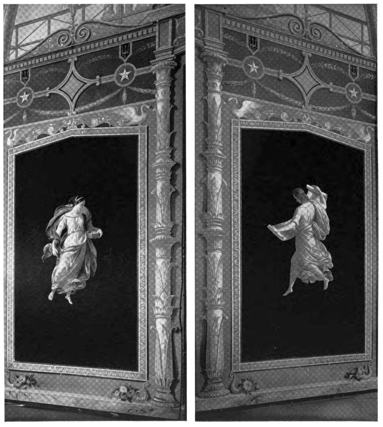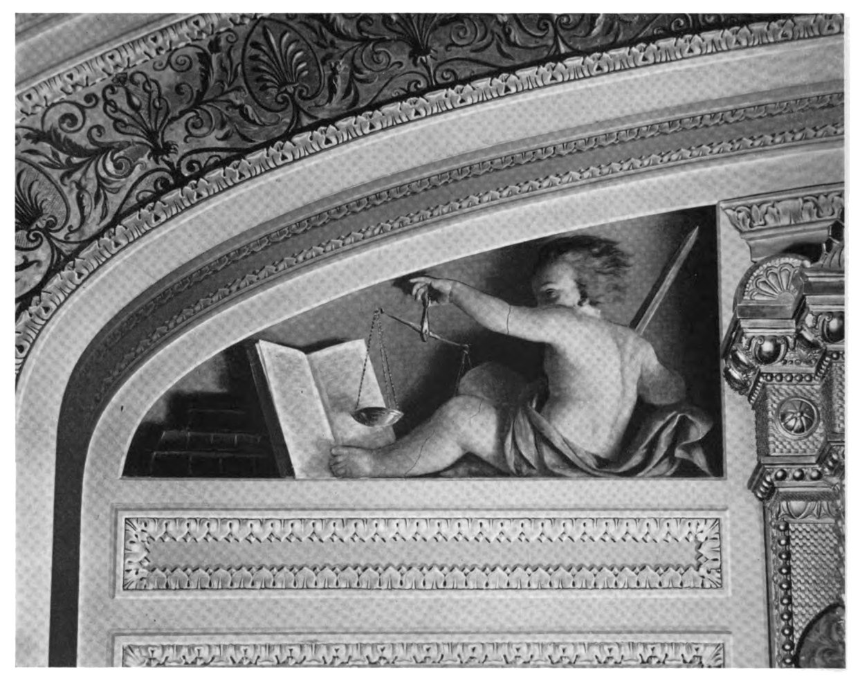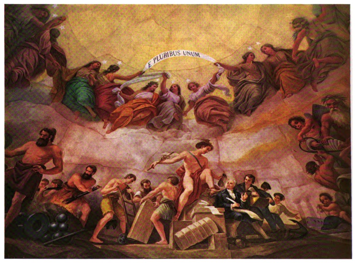 The early settler in North America had little opportunity for monumental painting. The austerity of religious belief dominating many new world settlements, infused as they were with the spirit of the Reformation, afforded meager encouragement to its development. American artists, following Benjamin West to England, leaned heavily upon British custom and precedent. West’s pupils—Charles Willson Peale, Gilbert Stuart and Joseph Wright—became makers of likenesses, and liberty-loving John Trumbull pursued historical painting to produce four of the eight great framed pictures of the Rotunda of the Capitol. Contrasted with Brumidi’s paintings, these mark the difference between the easel picture, a loosely related, detachable embellishment, and mural decoration designed in scale and color especially to enhance architecture.