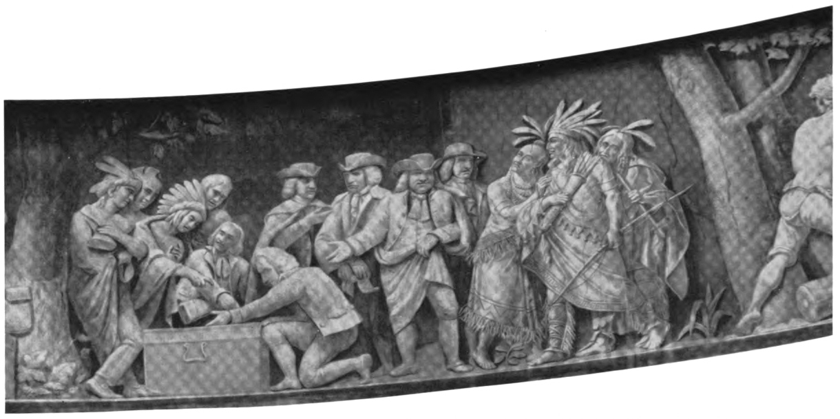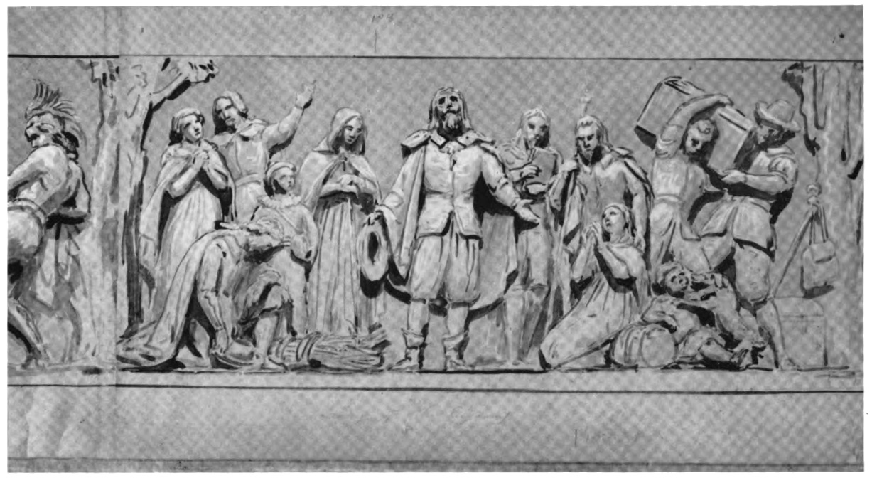 The availability of the priceless scroll of working sketches for the Rotunda Frieze has been too late for detailed study at this time and almost too late for a place in this Brumidi book. However, the sketch of the Landing of the Pilgrims reproduced above gives the reader an opportunity to make his own comparisons between one working sketch and its actual rendition in fresco on the belt encircling the Rotunda of the Capitol, as appears on page forty-four.