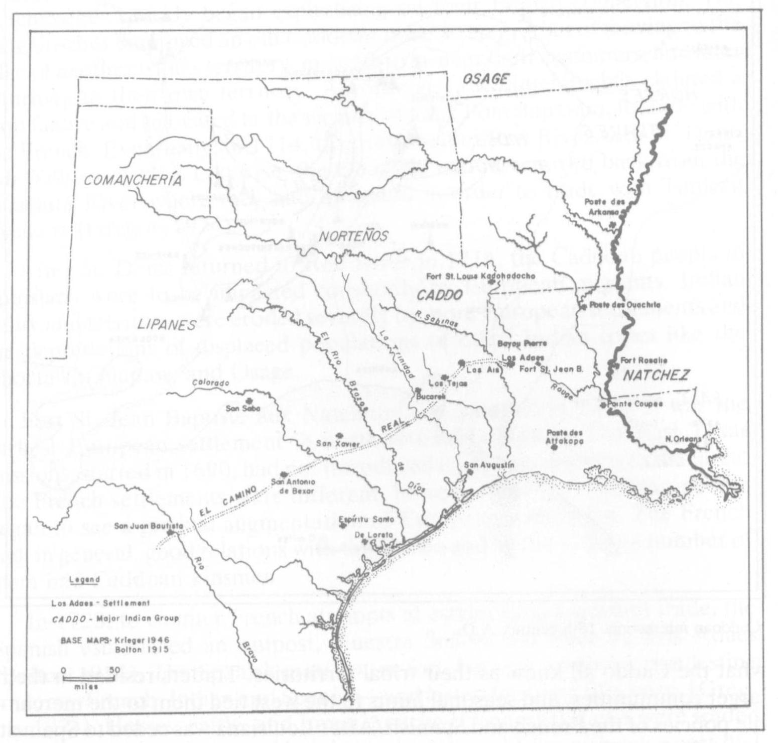 As was pointed out, the Adaes and Yatasi apparently were fairly closely related, and they may not have been real tribes, but rather a series of kin-linked bands, each with its own autonomy. The Caddoan term for these groups sounds much like a more inclusive term which lumps small, scattered groups. Whether their “chiefs” were really chiefs or local, heuristic leaders remains problematical. Bolton (1914) mentions chiefs, stating that the Athanase de Mézières gave peace medals to two chiefs, Cocay and Gunkan, in 1768.