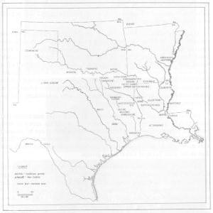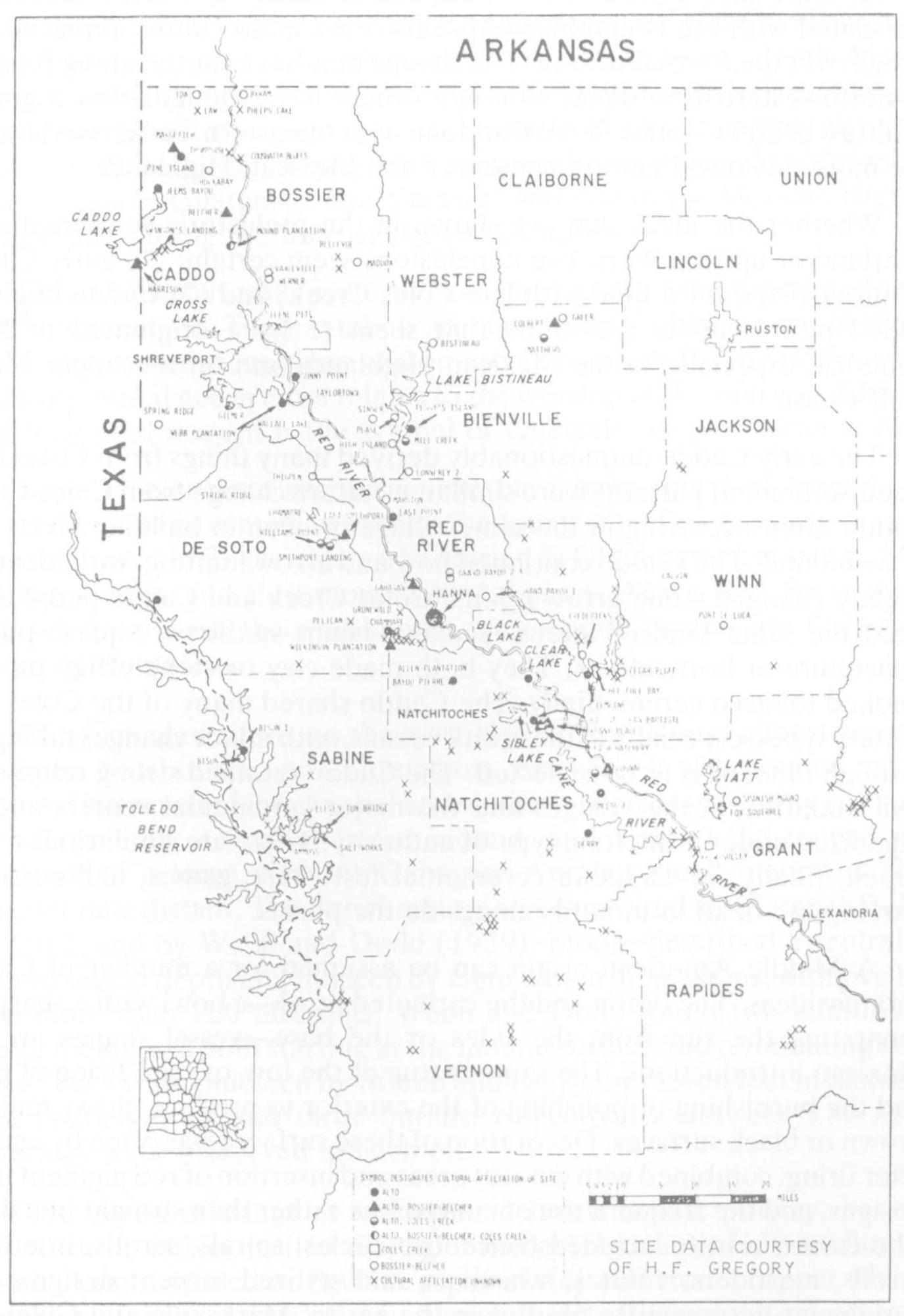 Since the early American policy has obscured the tribal diversity and history of the Caddoan groups in Louisiana, it seems in order to return to the older practice of recognizing the individual groups. Each will be discussed[24] briefly, in turn, and archaeological sites will be related where possible. As was the practice in French and Spanish days, the tribes will be discussed from southernmost to northernmost, as they would be encountered as one ascended the Red River.