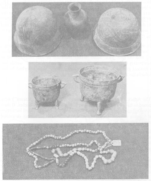Historic Natchitoches pottery, French iron tripod pots, and Venetian glass trade beads. These 18th century A.D. artifacts were found at the Southern Compress and Lawton sites.