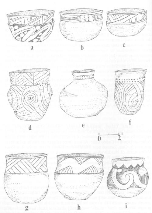 Belcher pottery was superior to that of the Bossier people and, indeed, is some of the best in the entire Caddoan area. There was a diversity of bowl, bottle, urn, jar, vase, miniature, and compound forms. Large storage ollas were found broken on house floors. Techniques of decoration involved engraving, stamping, incising, trailing, ridging, punctating, brushing, applique nodes, insertion of red or white pigment into designs, red slipping, polishing, pedestal elevation, rattle bowls, bird and turtle effigies, and tripod and tetrapod legs. Many of the vessels had ornate or intricate curvilinear designs, with scrolls, circles, meanders, spirals, and guilloches; sun symbols, crosses, swastikas, and triskeles were added.
