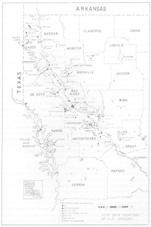 Distribution of principal archaeological sites in northwestern Louisiana. Reprinted with permission of New World Research and the U.S. Army Engineer District, New Orleans.