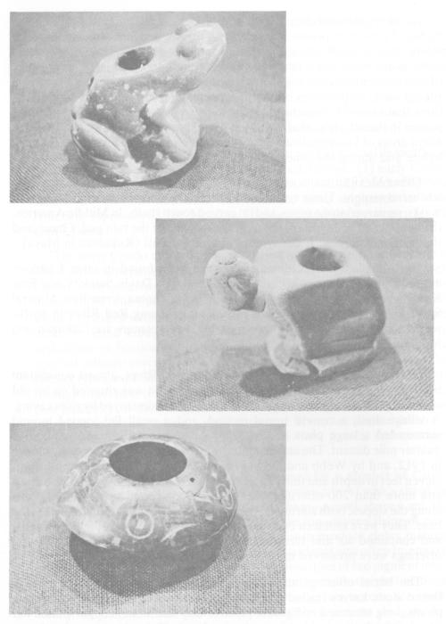 Frog and human effigy stone pipes and polished and engraved pottery vessel made about A.D. 1050. Artifacts from the Gahagan Mound site, Red River Parish, Louisiana.