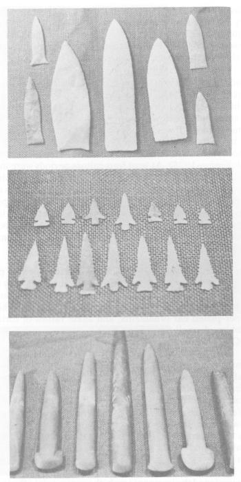 Prehistoric Caddoan stone knives, finely chipped arrow points, and ceremonial polished greenstone celts from Gahagan Mound site. These Early Caddo artifacts date to the 11th century A.D.
