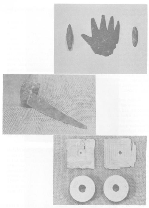 Preserved offerings included an ornate pottery bowl, decorated with a thumb-finger cross and eye symbols, flint knives of Gahagan type, fifty-three arrow points, a long-stemmed pipe, copper-plated ear ornaments, puma teeth, and objects of wood which included knife handles, a comb, a baton, several small bows, and wooden frames. Also present were leather, plaited cording or twine, and about 200 fragments of split cane woven mats, some of them with diamond or bird head designs. A half pint of seeds beside the important male were identified later as purslane (Portulaca oleracea), a plant sometimes used for food by aboriginal people. Also beside the male were four objects typical of Poverty Point or late Archaic manufacture: two long polished stone beads, a polished hematite plummet, and half of a perforated slate gorget. These ancient objects, from a time 2000 years before the Caddo burial occurred, must have been found and kept as venerated talismans by the Caddo leaders.
