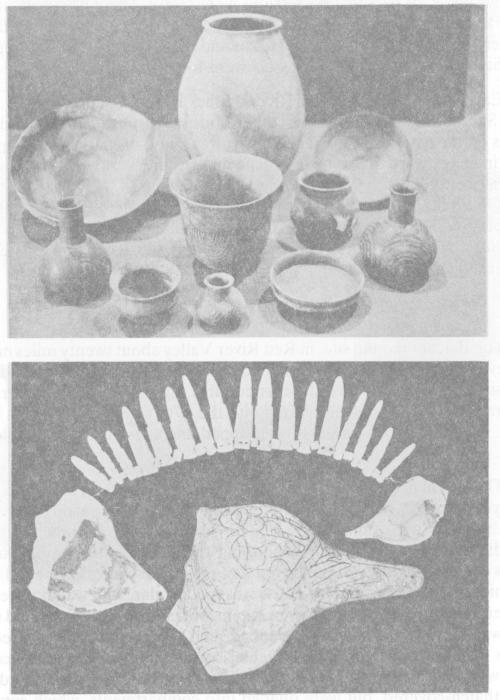 Ornaments found with burials or on house floors at Belcher include beads, anklets, pendants and gorgets of shell, pearls, ear ornaments of shell, bone and pottery, bone hairpins, bear tooth pendants, shell inlays, and small shell bangles. Some of the shell pendants were carved in lizard or salamander effigy forms. Ceremonial drinking cups made of conch shells were sometimes decorated, one bearing a composite flying serpent-eagle design. Platform and elbow pipes were of baked clay. Split cane basketry or matting fragments show herringbone or 1-over-4-under weave.