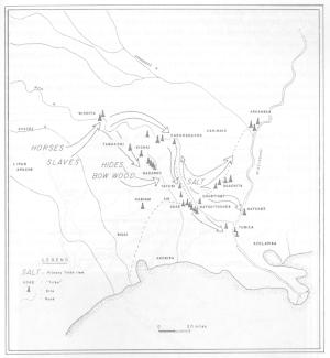 In 1701 Governor Bienville and Louis Juchereau de St. Denis, guided by the Tunica chief, Bride les Boeufs or Buffalo Tamer, arrived at the Natchitoches area. They visited the Doustioni, Natchitoches, and Yatasi villages, and then returned to New Orleans. Bienville was especially desirous of contacting the Kadohadacho to the north (Williams 1964; Rowland and Sanders 1929). This trip, ostensibly for exploration, was probably an attempt to obtain two commodities the French in lower Louisiana were desperate for: livestock and salt (Gregory 1974). The Tunica had long engaged in the Caddoan salt, and later, horse trades (Brain 1977), and like them, the Natchitoches quickly began capitalizing on their French connection. The Natchitoches employed an old Caddoan trade strategy, that of moving to the edge of another tribe’s territory, in order to be near their customers, and later returning to their own territory. Accordingly, the Natchitoches claimed a crop failure and relocated to the vicinity of Lake Pontchartrain, to trade with the French. Eventually, in 1714, they returned to Red River with St. Denis (McWilliams 1953). Likewise, the Ouachita had just moved back from the Ouachita River where they had relocated in order to trade with Tunican speakers (Gregory 1974).