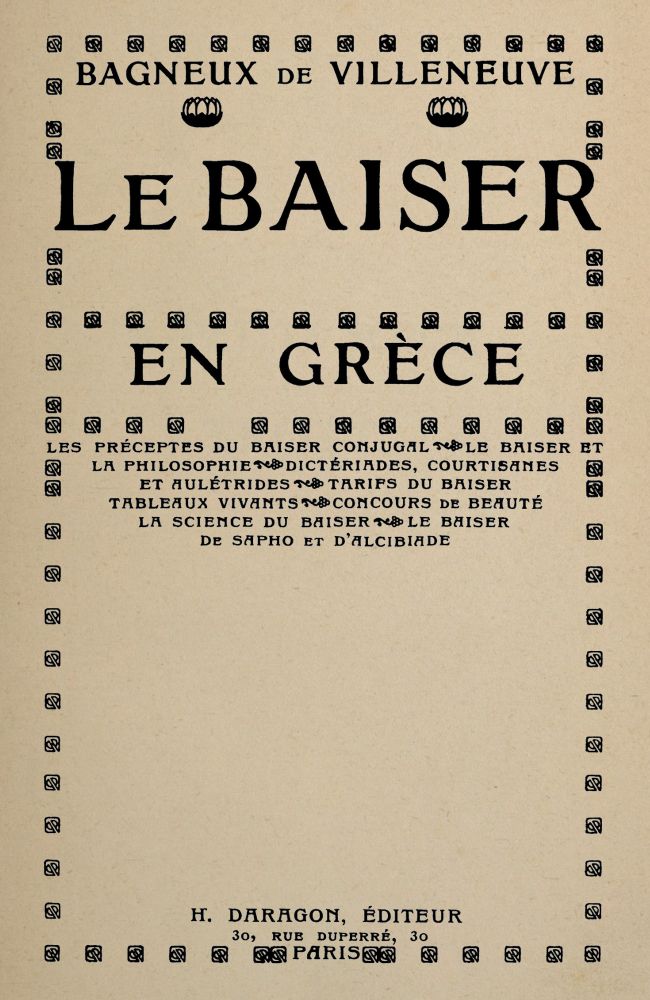 Le Baiser et la philosophie — Le Baiser conjugal — Les grandes Hétaïres — Le Baiser vénal — La Science du Baiser — Le Baiser dans les Arts — Le Baiser de Sapho et d’Alcibiade — Le Culte du Baiser