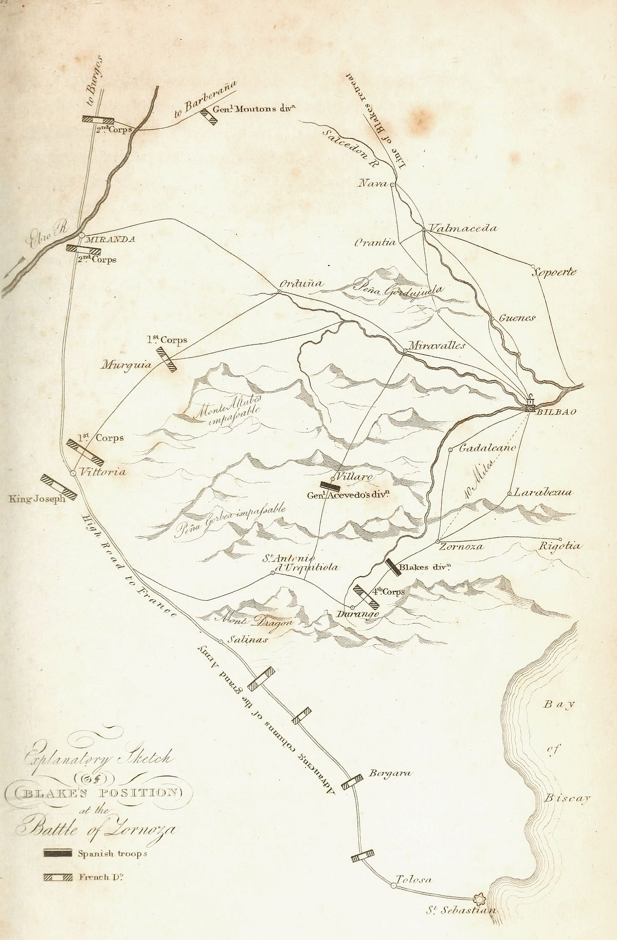 [30] On ne comprend pas dans ces celculs les garnisons de Pampelune, St. Sebastien, Vittoria, Tolosa, Bilbao, &c.: il n’est pas question non plus de l’armée de Catalogne.