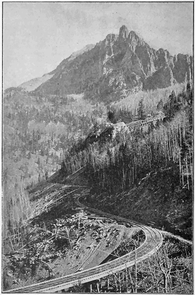 Leaving Rico, the line continues up the Dolores, which grows smaller and smaller, until it becomes a mere silver thread winding in and out among huge rocks and boulders. Thirteen miles north of Rico, and after climbing many miles of three and four per cent, grades, the summit of the Lizard Head Pass is reached at an elevation of nearly 11,000 feet. From the summit and to the left will be seen the Lizard Head, a peculiar rock formation capping a tall, bare mountain. This rock derives its name from its resemblance to the head of a mountain lizard, though at the same time it may be said to resemble the shaft of some large monument.
