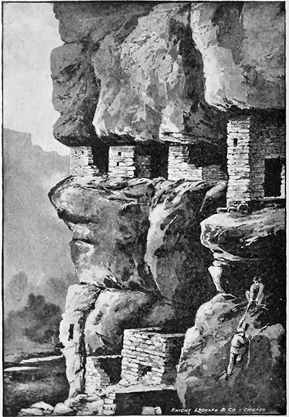 To the south of Mancos station within a day's drive, and easily accessible, are the ruins of the strange habitations of an extinct and mysterious race known as the Cliff Dwellers. To those seeking curiosities and wonders, the great Cañon of the Mancos, the great Montezuma Valley, the McElmo Cañon, the Lower Animas Valley and the Chaco Cañon are the wonderlands of the world. They contain thousands of homes, and a town of the ancient race of Mound Builders and "Cliff Dwellers," that has attracted the curious ever since the discovery of America. The great Mancos Cañon contains hundreds of these homes which were built and occupied hundreds of years ago. Yet many of them are in a good state of preservation, and in them have been found hundreds of specimens of pottery, and implements of husbandry and warfare. This cañon is twenty miles south of Mancos, over a good wagon road. The cañon is cut through Mesa Verda, a distance of thirty miles, and the walls on either side rise to a perpendicular height of two thousand feet. These cliff dwellings are built in the sides of this cañon, as shown in the illustration. Fifteen miles farther west from the Mancos is situated the great Montezuma Valley, where thousands of fine specimens of pottery have been found among the ruins of that ancient people. On the west side of this valley is the great McElmo Cañon, also full of the ancient homes of the "Cliff Dwellers." Thirty-five miles south of Durango, in the valley of the Animas, are some extensive ruins of the Aztecs, and fifty miles further south are the wonderful ruins in the Chaco Cañon. These ancient Pueblos are, without doubt, the most extensive and the best preserved of any in the United States. Of these Prof. Hayden, in his report of the Geological Survey of the United States for the year 1866, says: "The great ruins in the Chaco Cañon are pre-eminently the finest examples of the works of the unknown builders to be found north of the seat of ancient Aztec Empire in Mexico." There are eleven extensive Pueblos in this cañon, nearly all in a good state of preservation, and their appearance indicates that they were once the home of fifteen hundred to three thousand people each. They are the most accessible from Mancos of any point on the line of railroads. From the thousands of ruins of cities, towns and families found throughout this great San Juan Valley, it is evident that once this great valley was the home of hundreds of thousands of this extinct race. That they were a peaceful and agricultural race of people is evidenced by the large number of their implements of husbandry and specimens of corn and beans found in these ruins, besides irrigating ditches and reservoirs for the storage of water.