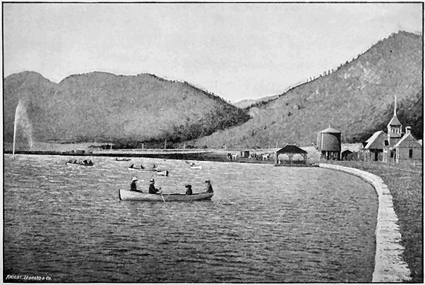 From Alamosa a delightful side trip can be taken to the Hot Springs at Wagon Wheel Gap, and to the new and already famous mining camp, Creede, for which a reduced rate will be given. A word about this wonderful health and pleasure resort will not be out of place here. As the Gap is approached the valley narrows until the river is hemmed in between massive walls of solid rock which rise to such a height on either side as to throw the passage into twilight shadow. The river rushes roaring down over gleaming gravel or precipitous ledges. Progressing, the scene becomes wilder and more romantic, until at last the waters of the Rio Grande pour through a cleft in the rocks just wide enough to allow the construction of a road along the river's edge. On the right, as one enters, tower cliffs to a tremendous height, suggestive in their appearance of the Palisades of the Hudson. On the left rises the round shoulder of a massive mountain. The vast wall is unbroken for more than half a mile, its crest presenting an almost unserrated sky line. Once through the Gap, the traveler, looking toward the south, sees a valley encroached upon and surrounded by hills