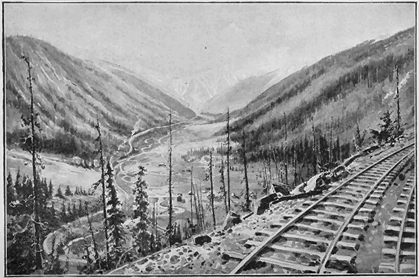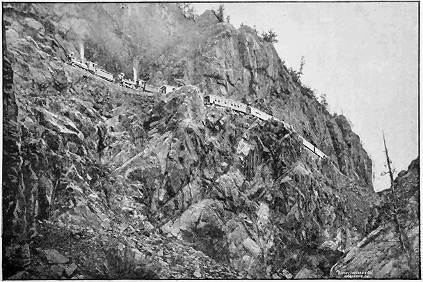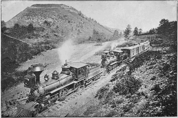 Shortly after sighting the Spanish Peaks, the ascent of Veta Pass is begun The ascent of this famous pass is one of the great engineering achievements of the Denver & Rio Grande Railroad. The line follows the ravine formed by a little stream. La Veta Mountain rising to the right. At the head of this gulch is the wonderful "Mule-Shoe Curve," the sharpest curve of the kind known in railroad engineering. In the center of the bend is a bridge, and the sparkling waters of the mountain stream can be seen flashing and foaming in their rocky bed below. Standing on the rear platform of the Pullman car as the train rounds the curve, the tourist can see the fireman and engineer attending to their duties. From this point the ascent of Dump Mountain begins, rocks and precipitous escarpments of shaley soil to the right and perpendicular cliffs and chasms to the left. The ascent is slowly made, two great Mogul engines urging their iron sinews to the giant task. The view to the eastward is one of great extent and magnificence. The plains stretch onward to the dim horizon line like a gently undulating ocean, from which rise the twin cones of "Wahatoya," strangely fascinating in their symmetrical beauty. At the summit of the pass the railroad reaches an elevation of 9,393 feet above the sea.