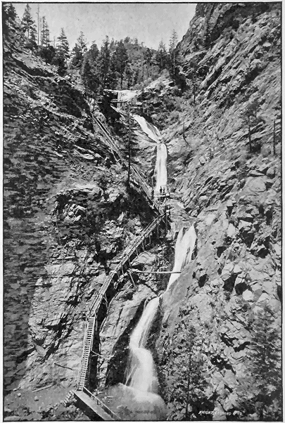 For a hundred and twenty miles the railroad extending to the south follows the front range of the Rocky Mountains, which is in plain view on the right and to the west. After Denver has been left behind, the tourist can see from the car window the snow-covered pinnacles of Long's, James', Gray's and Pike's Peaks standing in a wilderness of lesser mountains. Soon a remarkable promontory rising from the summit of a conical hill and presenting the appearance of an ancient round tower, attracts the tourist's attention. This is Castle Rock, under whose battlements nestles a picturesque village of the same name. Beyond Castle Rock the country becomes more broken, the ascent being now begun at what is known as the Divide, a range of hills extending eastward into the plains and rising to an elevation of 7,500 feet. Curious formations of sandstone frequently occur, the most notable of which is called Casa Blanca, and can be seen on the right between Greenland station and Palmer Lake. This enormous monolith is a thousand feet in length and two hundred feet high, and on account of its size, its snow-white walls and its castellated appearance, can hardly fail to attract attention. On the summit of the Divide is Palmer Lake, a lovely little sheet of water, so equally poised that its waters flow through outlets northward into the Platte and southward into the Arkansas. Here has been established a pleasant summer resort, and here also is Glen Park, where assemblies are held each summer, modeled on those of the well-known Chautauqua.