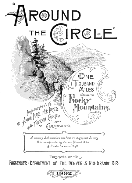 THE journey "Around the Circle" on the Denver and Rio Grande Railroad, from Denver to Silverton, Silverton to Ouray, and return to Denver, or via the Denver & Rio Grande to Durango, thence over the Rio Grande Southern R. R. to Ridgway and return to Denver, briefly described in the following pages, comprises more noted and magnificent scenery than any other trip of similar length in the known world. Piercing the heart of the Rocky Mountains, crossing and recrossing the "Great Divide" between the Atlantic and Pacific slopes; penetrating five cañons, each of which is a world's wonder, and no two having the same characteristics; climbing four mountain passes by rail and one by stage; achieving grades of 211 feet to the mile; reaching heights 11,000 feet above the sea; penetrating gorges whose walls soar a half mile in perpendicular cliffs above the track; traversing fertile and picturesque valleys, watered by historic rivers; passing through Indian reservations and in sight of frontier cantonments of National troops; pausing in the midst of mining camps, where gold and silver and coal and copper are being taken from subterranean recesses; in a word, making the traveler familiar with peaks and plains, lakes and rivers, cañons and passes, mountains and mesas; with strange scenes in nature, aboriginal types of men, wonders of science and novel forms of art; surely no other journey of a thousand miles can so instruct, entertain, entrance and thrill the traveler as this trip "Around the Circle."