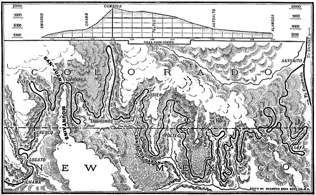 At Cumbres, the summit of the Cumbres range of mountains, is reached an elevation of 10,115 feet, the journey of the descent is a trip fraught with great variety of scenery and abounding in interest. Here may be seen mountain meadows lush with vegetation, the surrounding hills being heavily timbered and abounding in game.