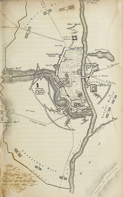 | System of terror—The convent of St. Monica taken—Spaniards attempt to retake it, but fail—St. Augustin taken—French change their mode of attack—Spaniards change their mode of defence—Terrible nature of the contest—Convent of Jesus taken on the side of the suburb—Attack on the suburb repulsed—Convent of Francisco taken—Mine exploded under the university fails, and the besieged are repulsed—The Cosso passed—Fresh mines worked under the university, and in six other places—French soldiers dispirited—Lasnes encourages them—The houses leading down to the quay carried by storm—An enormous mine under the university being sprung, that building is carried by assault—The suburb is taken—Baron Versage killed, and two thousand Spaniards surrender—Successful attack on the right bank of the Ebro—Palafox demands terms, which are refused—Fire resumed—Miserable condition of the city—Terrible pestilence, and horrible sufferings of the besieged—Zaragoza surrenders—Observations | 38 |