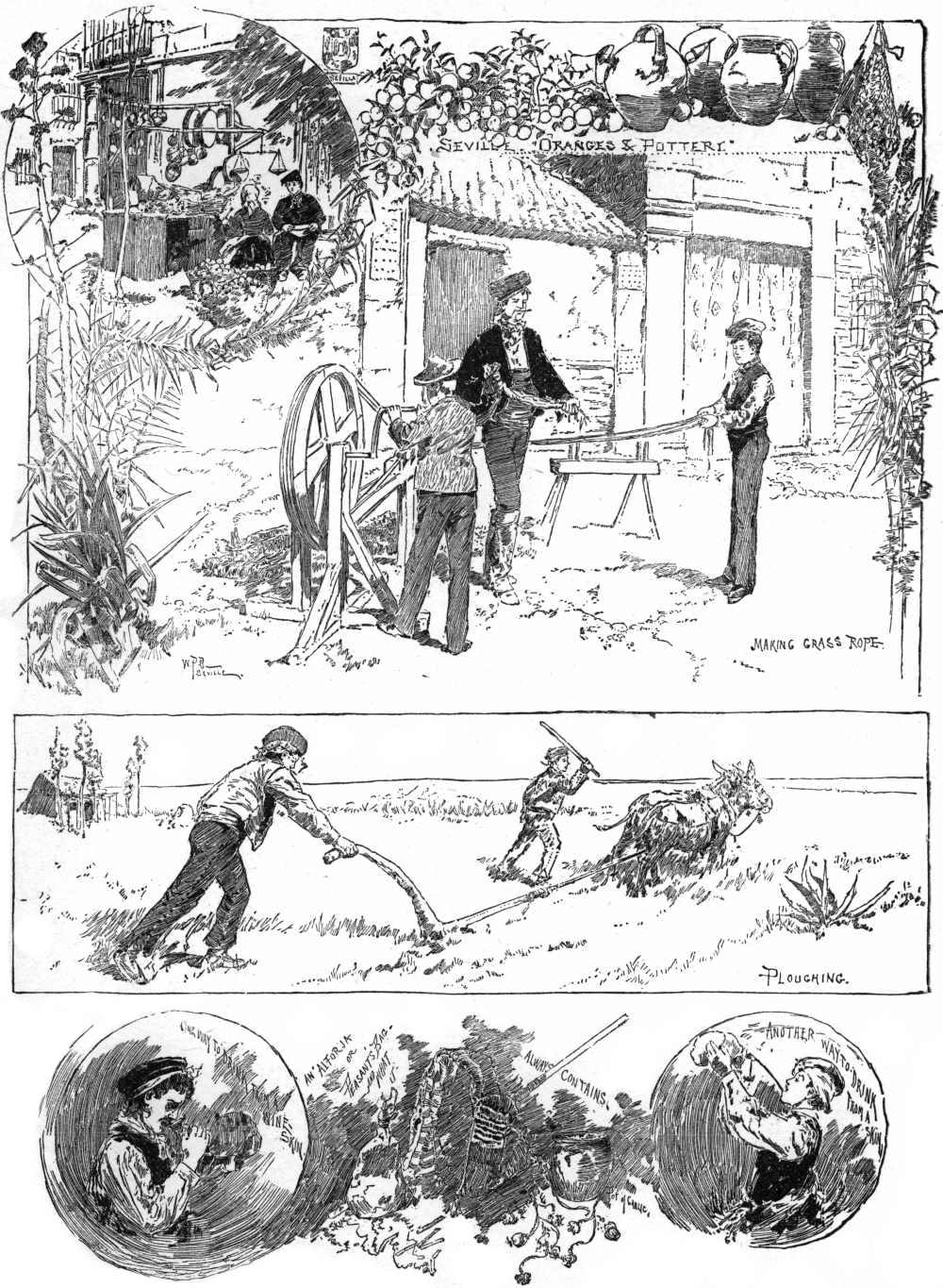 Down went the sods on the ground, and away went the barrow for some more; and again and again it went, until at least a dozen loads had been brought; and then, taking off his coat, the very brown young man, whistling merrily all the time, began to make a grass plot.
