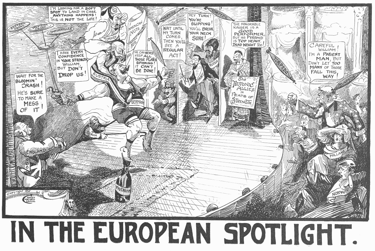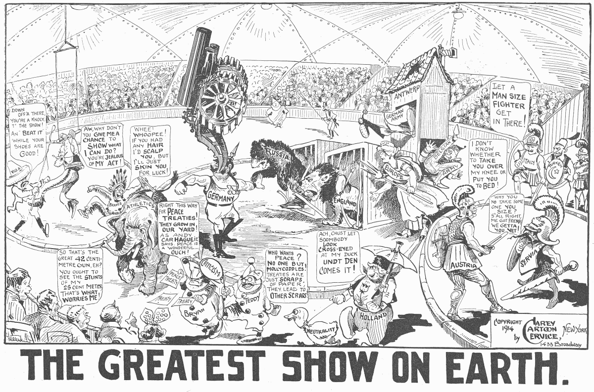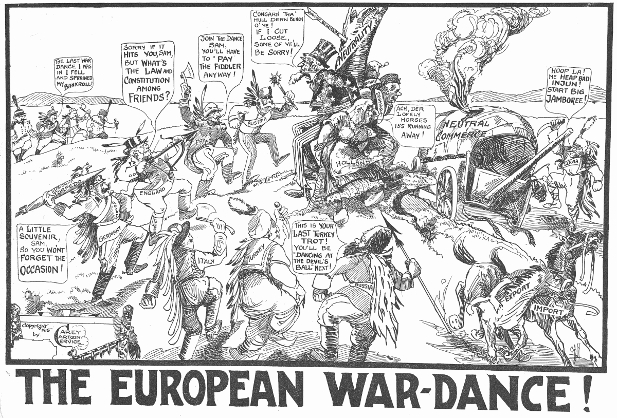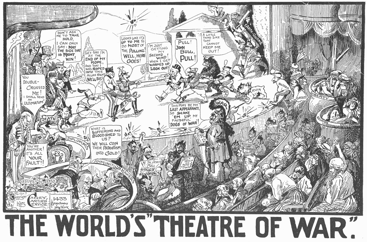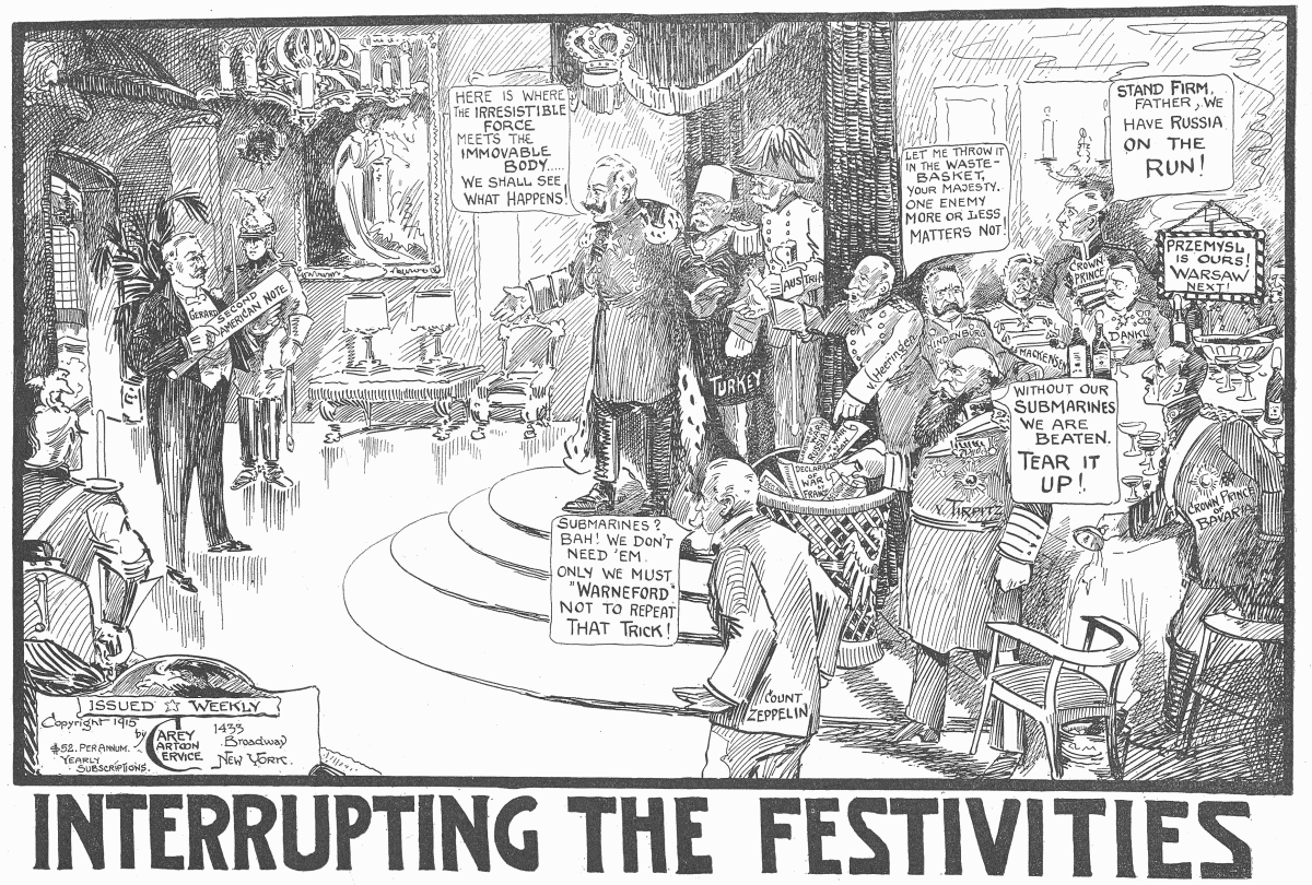 When the European War began, the subject did not appear very promising for cartoons intended for window display owing to the bitter partisan feelings the war engendered in the breasts of many whose ancestors came from one or other of the belligerent nations. Moreover, the President made a strong appeal to all citizens to refrain from unneutral words or deeds. In keeping with the spirit of the proclamation and out of deference to the feelings of very many citizens, absolute neutrality has been sought and maintained in the Carey war cartoons. This is no easy task and we believe that this difficult subject has been treated discreetly and masterfully as well. The cartoons are done in color and the artist has been accurate in his portrayal of the character and traits of the monarchs and peoples involved in the titanic struggle. The War being uppermost in the minds of all people at the present time, the cartoons are doubly effective on that account.