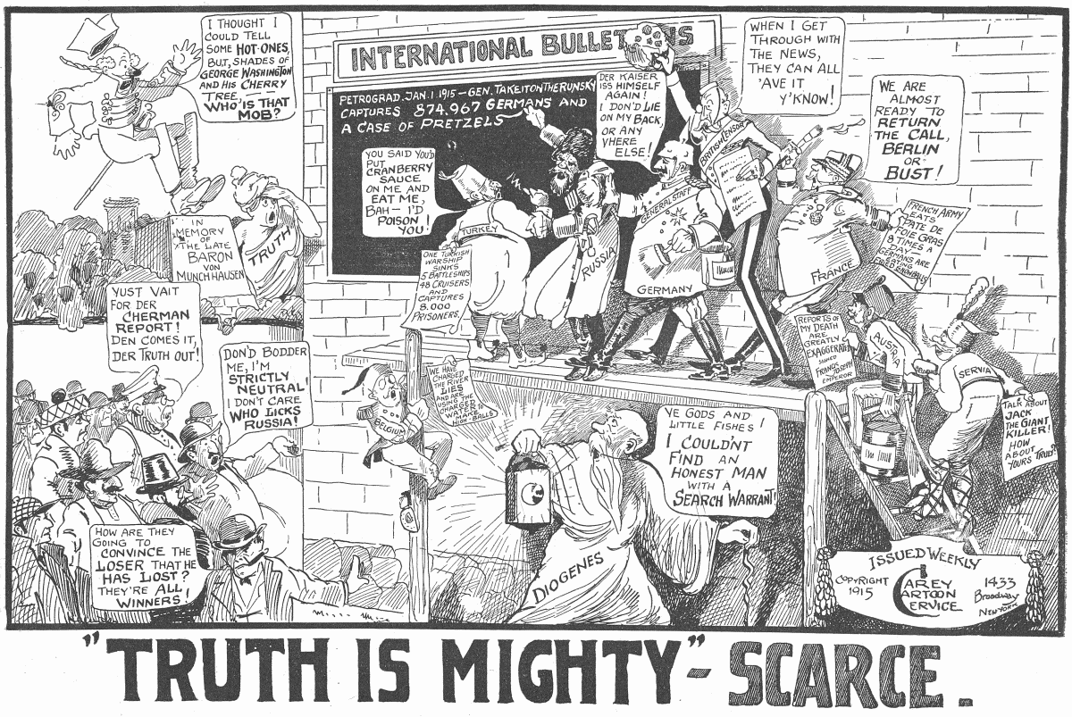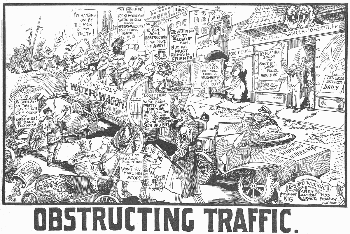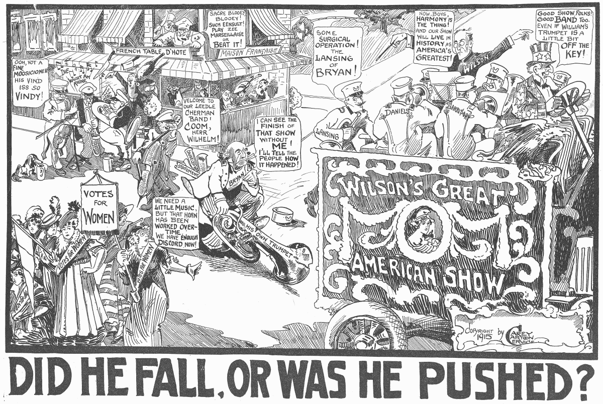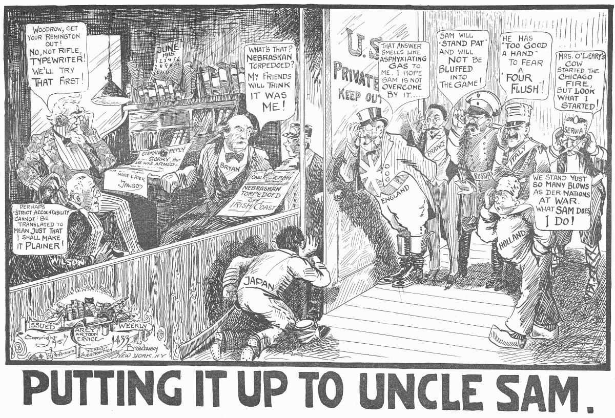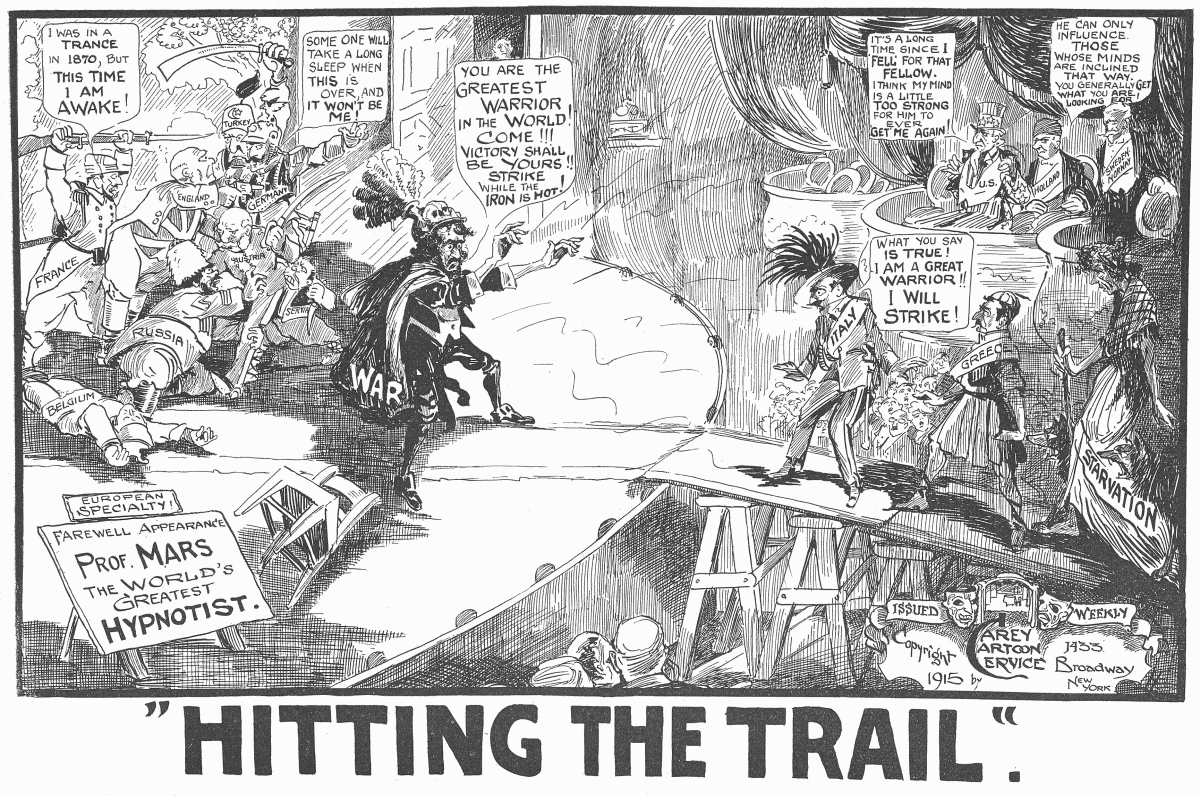 When the European War began, the subject did not appear very promising for cartoons intended for window display owing to the bitter partisan feelings the war engendered in the breasts of many whose ancestors came from one or other of the belligerent nations. Moreover, the President made a strong appeal to all citizens to refrain from unneutral words or deeds. In keeping with the spirit of the proclamation and out of deference to the feelings of very many citizens, absolute neutrality has been sought and maintained in the Carey war cartoons. This is no easy task and we believe that this difficult subject has been treated discreetly and masterfully as well. The cartoons are done in color and the artist has been accurate in his portrayal of the character and traits of the monarchs and peoples involved in the titanic struggle. The War being uppermost in the minds of all people at the present time, the cartoons are doubly effective on that account.