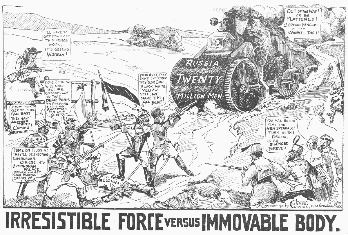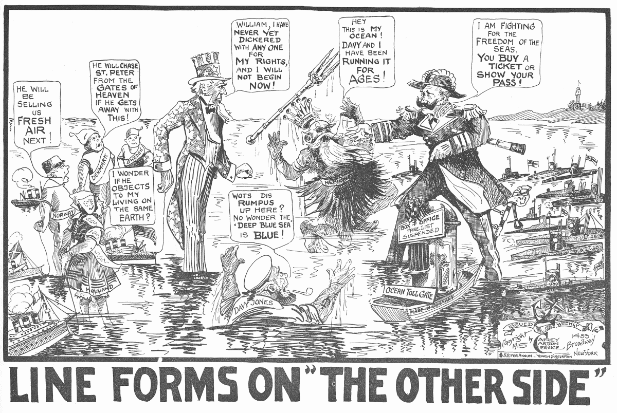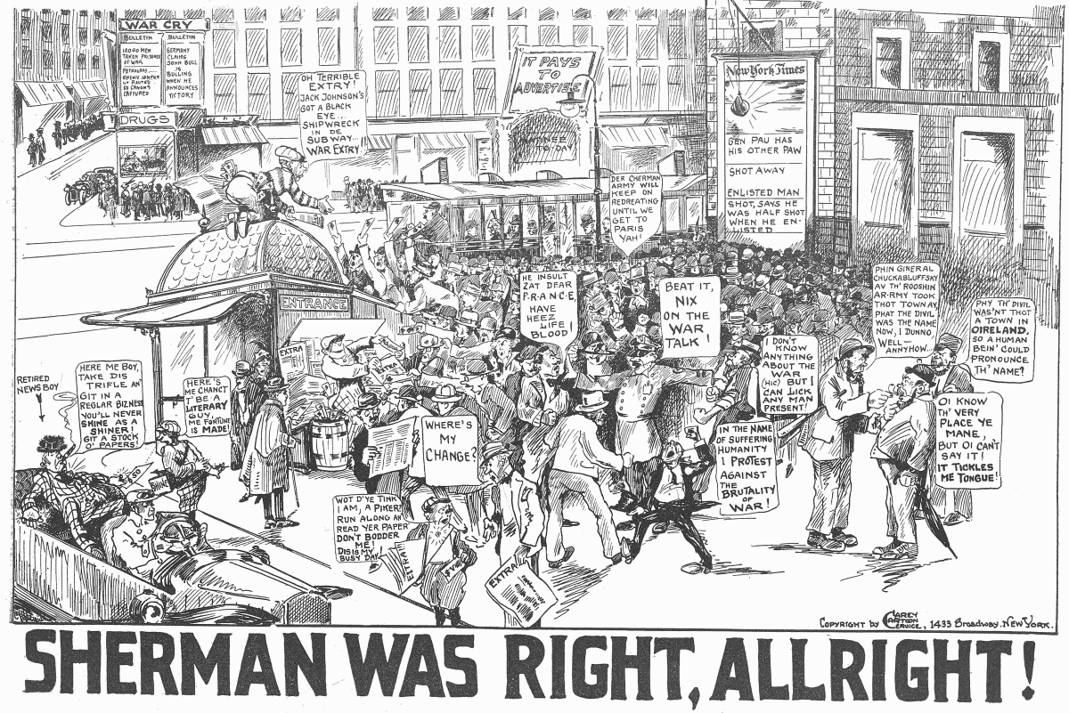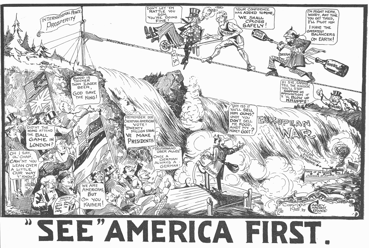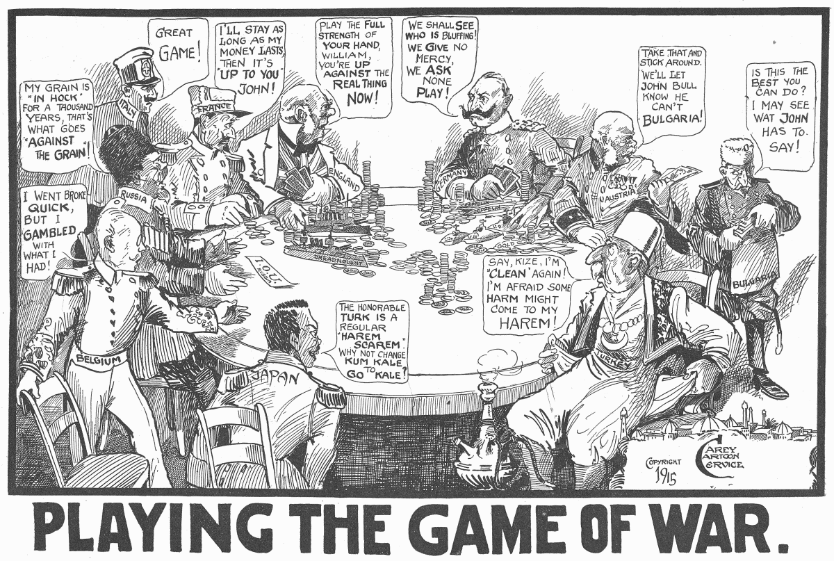 When the European War began, the subject did not appear very promising for cartoons intended for window display owing to the bitter partisan feelings the war engendered in the breasts of many whose ancestors came from one or other of the belligerent nations. Moreover, the President made a strong appeal to all citizens to refrain from unneutral words or deeds. In keeping with the spirit of the proclamation and out of deference to the feelings of very many citizens, absolute neutrality has been sought and maintained in the Carey war cartoons. This is no easy task and we believe that this difficult subject has been treated discreetly and masterfully as well. The cartoons are done in color and the artist has been accurate in his portrayal of the character and traits of the monarchs and peoples involved in the titanic struggle. The War being uppermost in the minds of all people at the present time, the cartoons are doubly effective on that account.