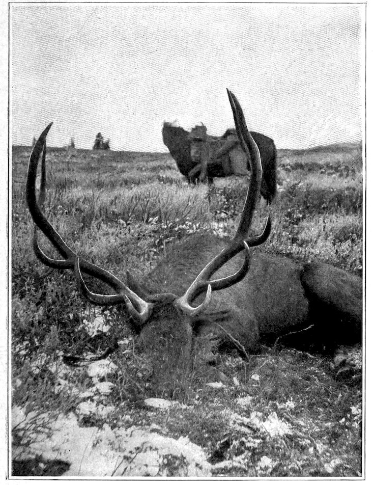 One evening in early October I was camped high among the mountains of western Montana. We were travelling with a pack-train, and had pitched our small tent among some firs by a brook, while the horses grazed in the little park or meadow close by. Elk were plentiful round about. We had seen their trails everywhere, and late in the afternoon we had caught a glimpse of a band of cows as they disappeared among the pines.