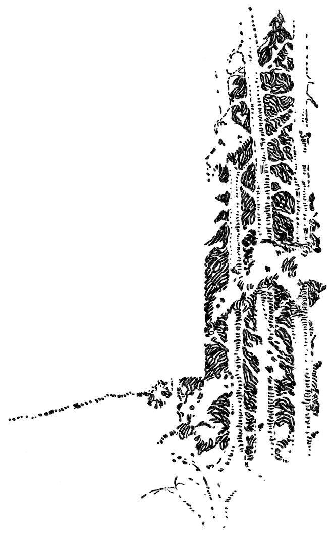 Looking at my watch, I saw that it was nearly dawn. I returned to the tent and laid down as I was under the blankets, and shivered and dozed for half an hour, then I came back to the meadow, where the pack-ponies stood motionless. In the brightening light the moon paled, and I was very soon able to pick out the bull’s trail on the frost-covered ground, where it was almost as plain as if he had been walking in snow. I saw that he had struck up a long valley, from which a pass led into a wooded basin. At the top of the pass I lost the trail entirely, and as it was almost impossible to see for any distance through the woods, I came to the conclusion that the best thing to do was to sit down and await events.