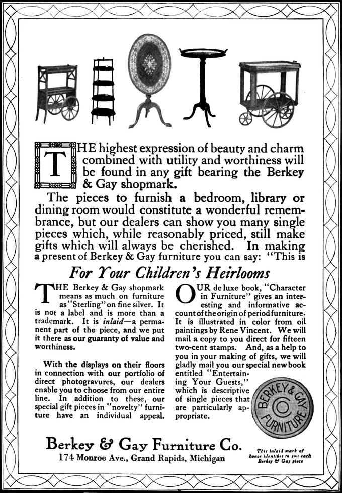 THE Berkey & Gay shopmark means as much on furniture as “Sterling” on fine silver. It is not a label and is more than a trademark. It is inlaid—a permanent part of the piece, and we put it there as our guaranty of value and worthiness.