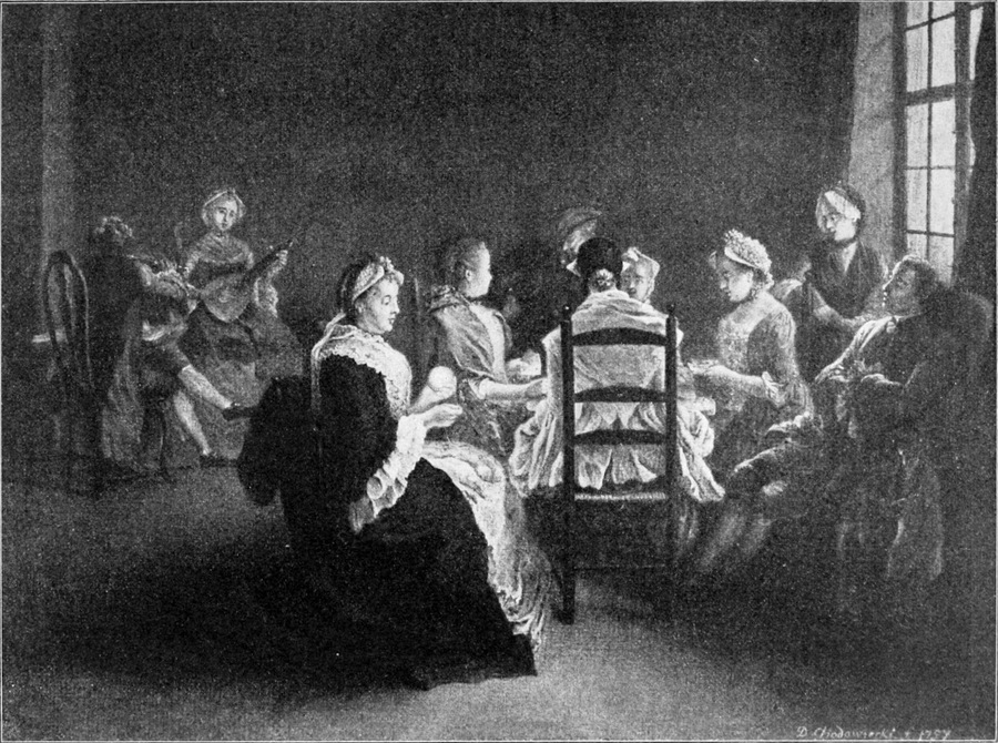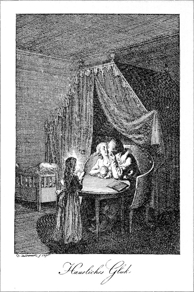 Über Daniel Chodowiecki ist mehr geschrieben worden, als von ihm zu sagen ist. Mit einer die Gewissenhaftigkeit des Meisters selbst fast noch übertreffenden Sorgfalt hat Wilhelm Engelmann in seinem beschreibenden Verzeichnis[1] alles zusammengetragen, was wir über die Radierungen Chodowieckis, ihre Zeitfolge und ihre verschiedenen Abdrucksgattungen wissen, und unlängst erst ist aus der Feder Wolfgangs von Oettingen eine umfassende und eindringende Darstellung seines Lebens und seiner Kunst erschienen, die wohl auf lange Zeit die Chodowieckiforschung abschließt. Die Abbildungen unseres Buches indes, die in solcher Fülle bisher noch keinem Werk über den Meister beigegeben wurden, rechtfertigen allein schon den Versuch, Chodowiecki auch dem großen Kreise näher zu bringen, für den er besonders gearbeitet: dem deutschen Hause, der deutschen Familie. Sehen ist in der Kunst mehr als Lesen, und Chodowieckis Kunst recht sehen lehren sollen vor allem die nachfolgenden Blätter.