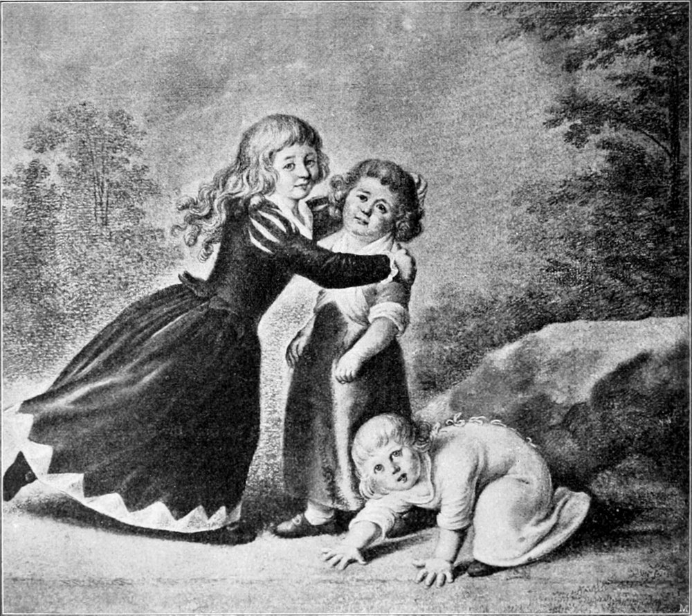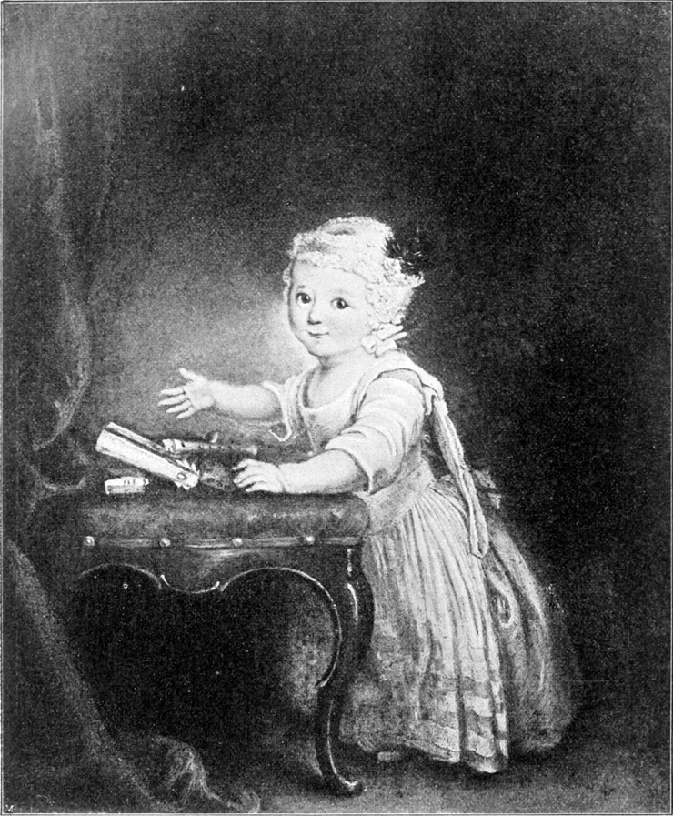 Am liebenswürdigsten und lebendigsten sind die Bilder von Mitgliedern seiner Familie, wie das ebenfalls in roter Kreide ausgeführte Profil seines Schwiegervaters, des ehrsamen Seidenstickers Jean Barez aus der Champagne (Abb. 169) oder der aus einem bauschigen Tüllschleier freundlich herausblickende Kopf seiner Frau, eine Miniatur auf Elfenbein (Abb. 171), der man das Bestreben anmerkt, die von Anton Graff nicht ganz glücklich getroffenen Züge (Abb. 177) noch schärfer zu individualisieren; ferner[S. 119] das allerliebste Kinderporträt seiner etwa zweijährigen Tochter Jeanette, die, an einem mit Spielzeug beladenen Stuhl stehend, mit schelmischen Augen dem Beschauer entgegenlacht (Abb. 31); als dreizehnjährigem, altklugem Backfisch begegnen wir ihr wieder in einem Rötelprofil (Abb. 178). Ebenso besitzen wir von der zweitältesten Tochter des Künstlers, Susette, ein Kinderporträt (Abb. 120) und eine Zeichnung aus späterer Zeit (Abb. 180). Auch die Züge seiner Söhne Wilhelm und Isac Heinrich (Abb. 181), sowie seiner Enkel (Abb. 121) sind in Bildern des Vaters auf uns gekommen. Die schelmischen Mädchengesichter der Schwestern Quantin schließlich, die ihm für eine seiner frühesten Radierungen Modell standen (Abb. 27), glauben wir in der ungewöhnlich frischen Bleistiftstudie im Besitz von Nachkommen Chodowieckis (Abb. 179) wiederzuerkennen.