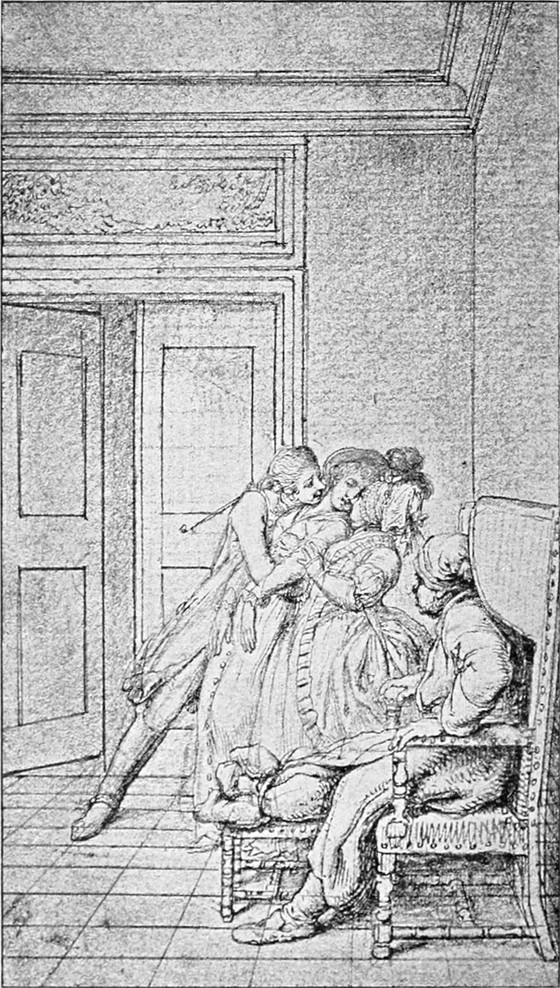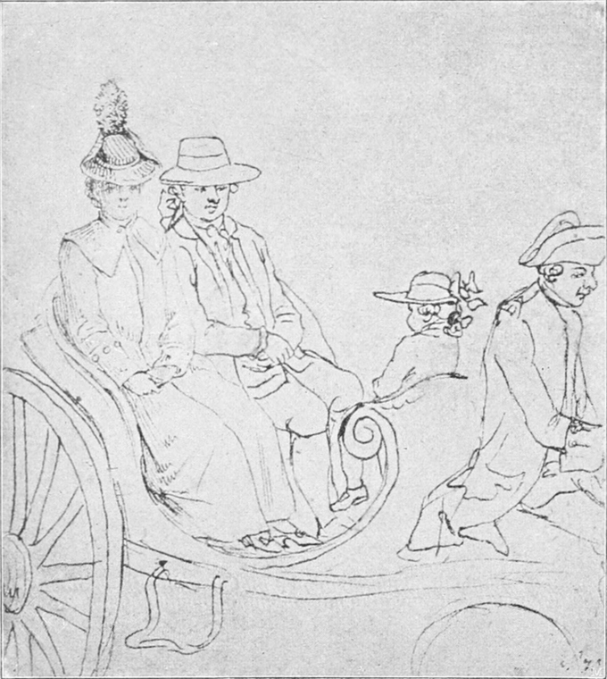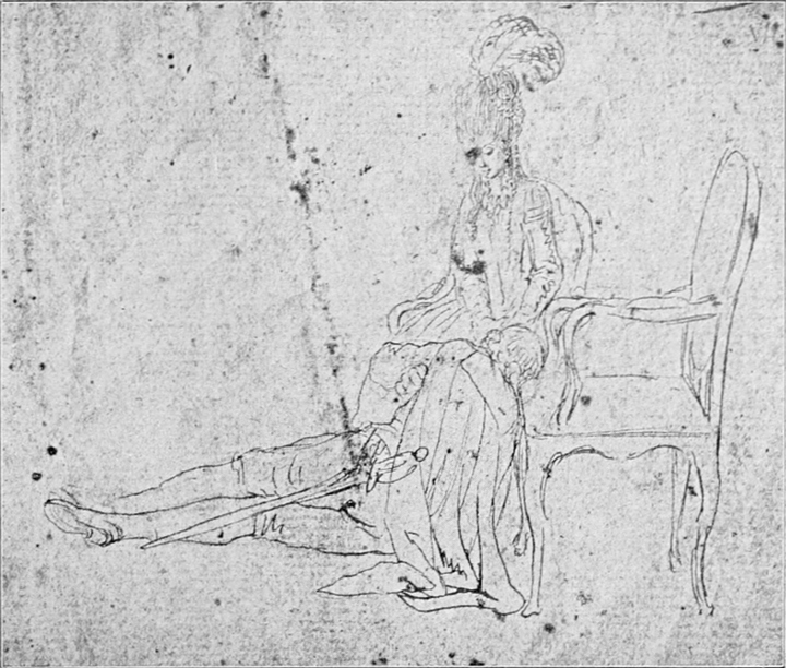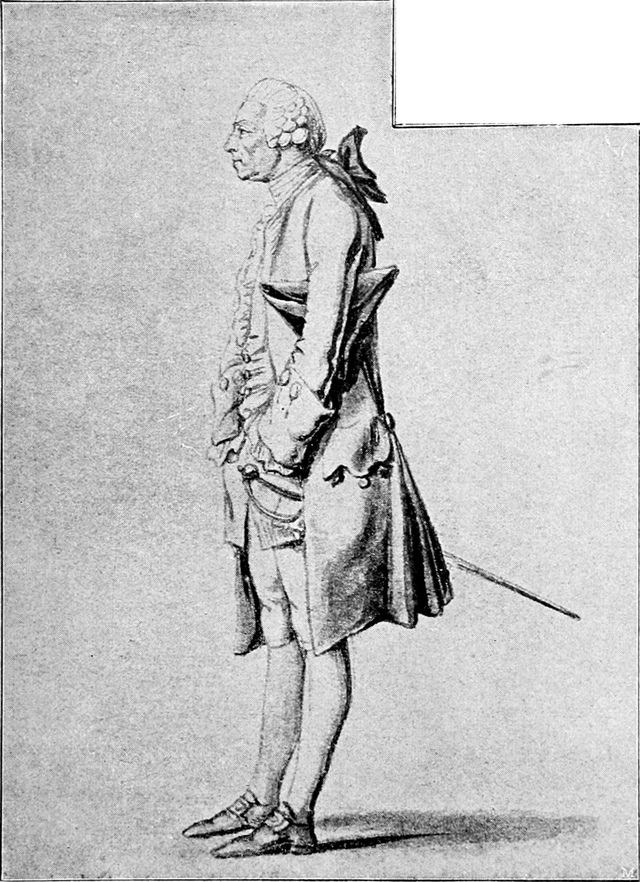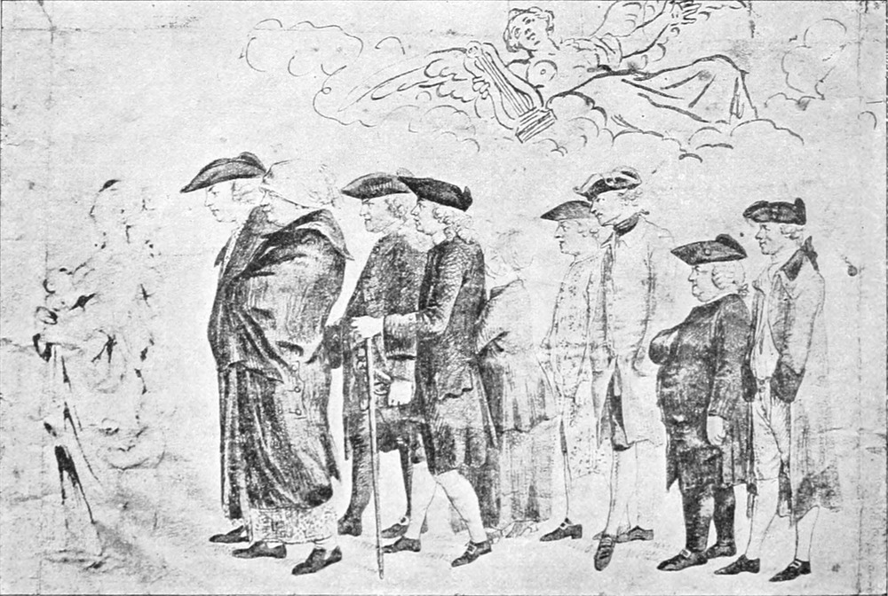 (Der letzte in der Reihe ist Chodowiecki.) Aquarellierte Federzeichnung im Besitz der Frau Dr. Ewald. Berlin.