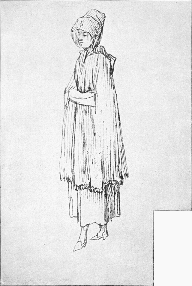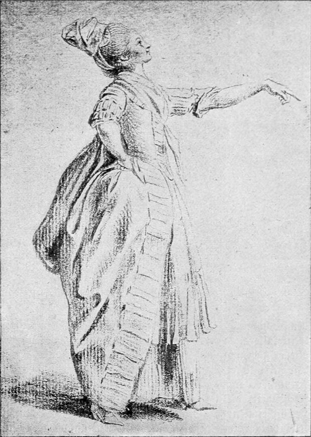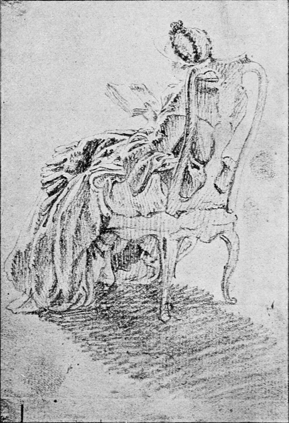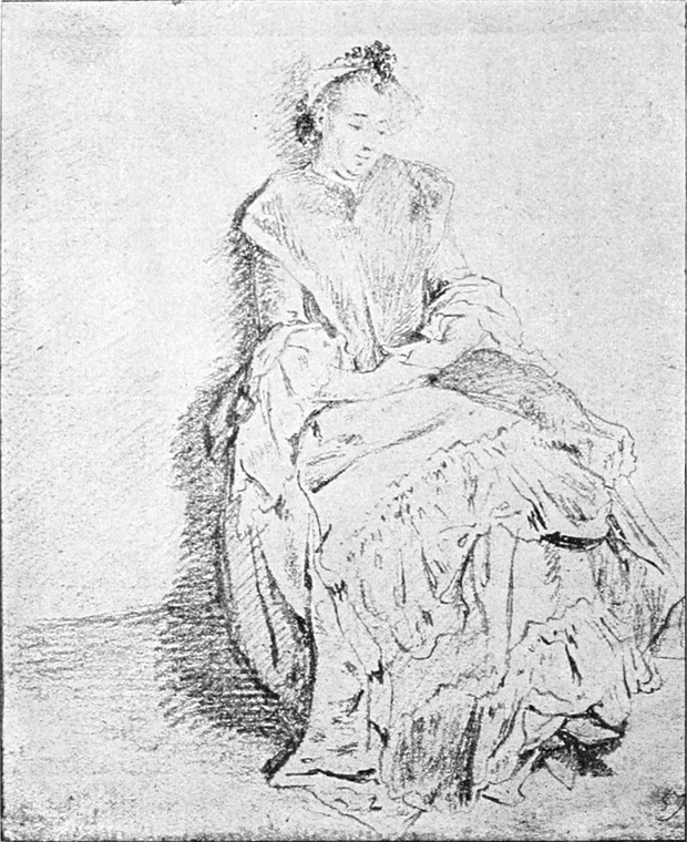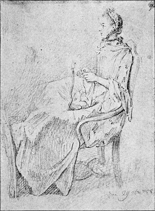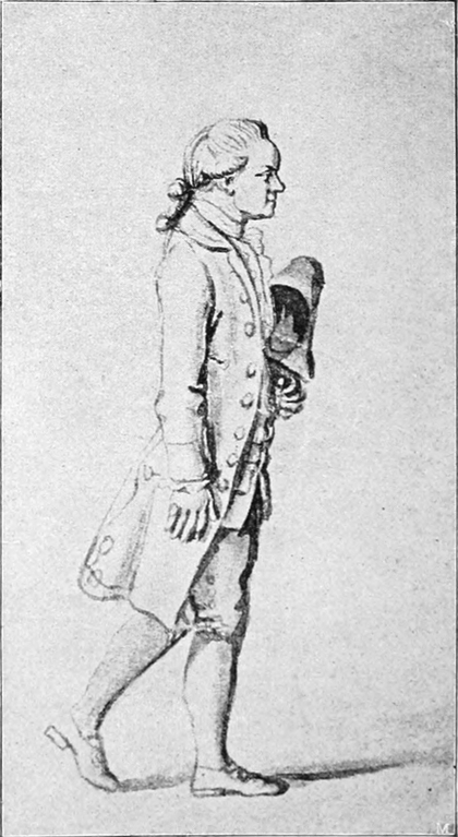 Wie hat sich Chodowiecki dies Glück der Unsterblichkeit errungen? Versuchen wir dem Wege nachzugehen, der ihn in den Kreis derer führt, die als Fixsterne am deutschen Kunsthimmel glänzen. Von dem unablässigen Fleiß, der keine Feierstunden kannte, ist gesprochen worden. Die technische Gewandtheit aber, die seinem Wollen das Gelingen sicherte, die glückliche Beobachtungsgabe und Frische der Auffassung, die ihn bis ins hohe Alter nicht verließ, waren nicht nur Ergebnis eifriger[S. 107] Studien, sie waren Geschenke der Natur. Wenn wir des Künstlers Skizzen betrachten — gerade sie sind die glaubwürdigsten Zeugen für die Echtheit des Talents, das sich in flüchtigen Augenblicken glücklicher Inspiration am reinsten offenbart — so entdecken wir eine Leichtigkeit der Hand, ein Unterscheidungsvermögen für Charakteristisches und Gleichgültiges, eine Fähigkeit, mit wenigem alles zu sagen, die wir aus den ausgeführten Arbeiten mit ihrer nicht selten kleinlich erscheinenden Accuratesse und ängstlichen Durchführung niemals herauslesen könnten. Diese flüchtigen Zeichnungen, wie die hier abgebildeten Studien eines[S. 108] vom Rücken gesehenen Kavaliers (Abb. 139), einer am Tisch stehenden Dame (Abb. 137), eines Mädchens, das ein Gepäckstück im Arm hält (Abb. 140) — sie alle sind in ausgeführten Werken, für die der Meister stets seine Mappen plünderte, benutzt — zeugen von einer gottbegnadeten Schärfe des Blicks, sie atmen ein Leben und eine Beweglichkeit, die, wie gesagt, oft den nach ihnen ausgeführten Arbeiten zu mangeln scheint. Selbst das, was man Chodowiecki zuletzt zutrauen möchte, leidenschaftliches Temperament, kommt in einzelnen Skizzen, wie in dem Entwurf zur Figur des Hamlet (Abb. 138, E. 252) zum Ausdruck. Man glaubt hier die Erregung des Augenblicks zu spüren, wo Shakespeares Gestalt in der genialen Interpretation Brockmanns die Einbildungskraft des Meisters zu ungewohnter Lebhaftigkeit entflammte. Zu diesen glücklichen, scheinbar direkt von inneren Impulsen angeregten Augenblicksschöpfungen zählen auch einige Blätter der Danziger Reise, wie die Kirchgängerinnen (Abb. 141, 142), das polnische Starostenpaar (Abb. 50), den Bürgermeister Conradi (Abb. 51), Frau Öhmichen (Abb. 143) und jene köstlichen Rötelzeichnungen, die uns Frauen und Mädchen bei ihrer Arbeit oder in träumerischer Selbstvergessenheit schildern (Abb. 144146). Hier ist Chodowiecki dem Charme eines Watteau so nahe gekommen, wie sonst nie; aber es steckt in seinen Gestalten unendlich größere Ehrlichkeit, viel mehr Respekt vor der Natur und sogar etwas mehr Energie[S. 109] der Technik (Abb. 147 bis 151).