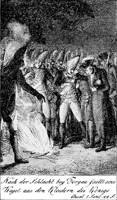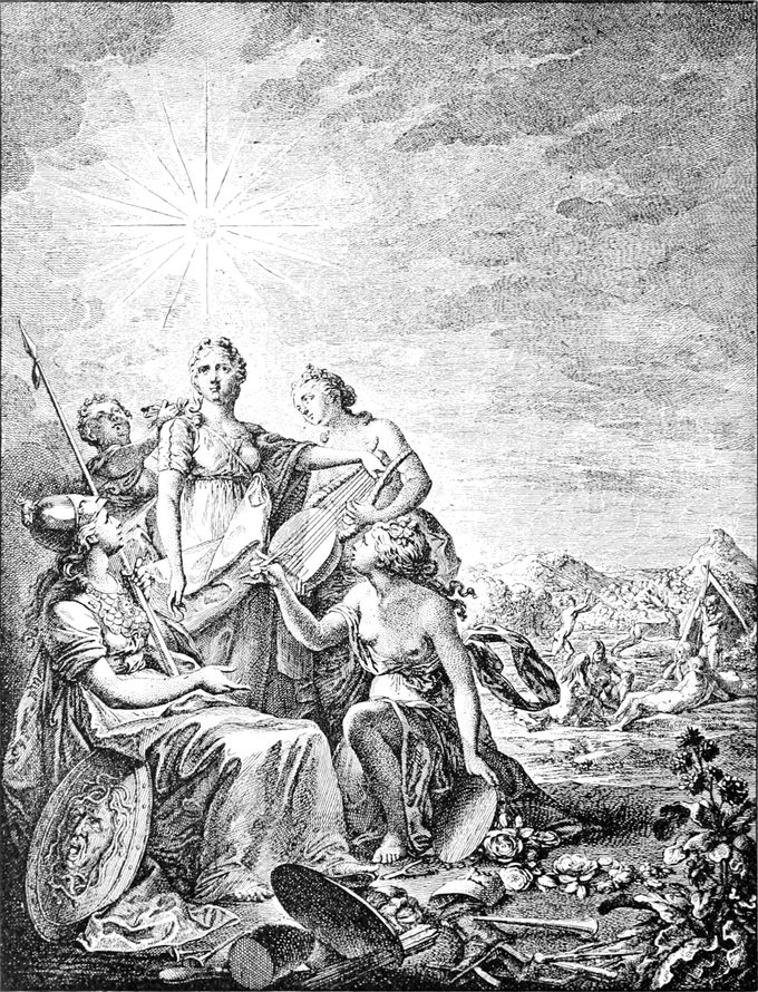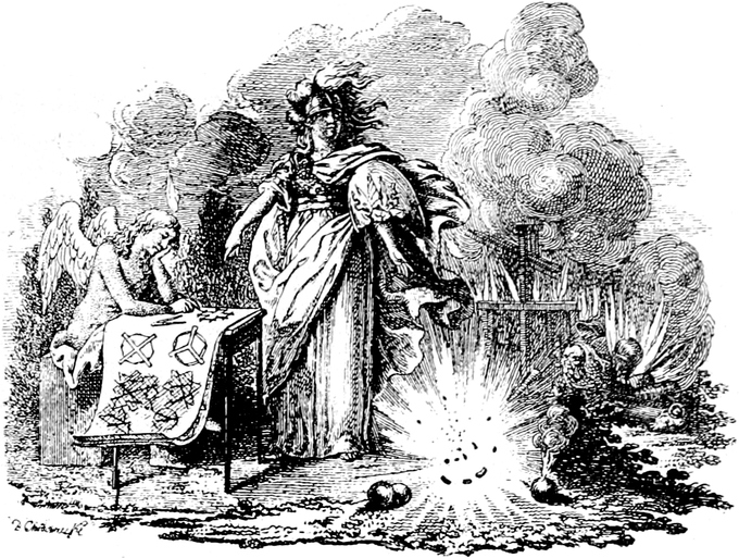 Die historischen Darstellungen unseres Künstlers fordern den modernen Beschauer, der stolz darauf ist, sich „in den Geist der Zeiten“ zurückversetzen zu können, zu herber Kritik, ja oft zum Spott heraus. Bei aller Gründlichkeit seiner Kostümstudien, die damals dem Maler nicht so erleichtert wurden, wie in unserem Zeitalter der Museen und Publikationen, weiß er doch mit Stoffen aus einer weiter zurückliegenden Zeit wenig anzufangen. Durch Panzer und Pluderhosen blickt überall das achtzehnte Jahrhundert mit seiner Zierlichkeit und bürgerlichen Wohlhäbigkeit durch (Abb. 161, 162). Vollends die alten Germanen, nach Klopstocks Vorgang als Kelten frisiert, eigentlich aber Weißbierphilister in Statistenhaltung, vermögen uns nicht zu überzeugen (Abb. 163), und die Antike, der seit Winckelmanns[S. 113] Tagen so viel aufmerksames Studium sich zuwandte, behält in Chodowieckis Gestaltung den ballettmäßigen Anstrich der Rokokokunst (Abb. 164). Die Formensprache der klassischen Kunst mit ihrer Einfalt und stillen Größe blieb für ihn stumm. Am schlimmsten aber steht es um seine sinnbildlichen Einfälle, die ein unerquickliches Gemisch von halbverstandenen und deshalb dem Beschauer unverständlichen Symbolen und nüchtern aufdringlicher Deutlichkeit darstellen. Das Bemühen, möglichst viel in die Allegorie „hineinzugeheimnissen,“ verdirbt ihm meist das künstlerische Konzept, und für das heroisch Große, das er versinnlichen möchte, fehlt ihm Linien- und Formengefühl. Wie[S. 114] mesquin wirkt z. B. seine Darstellung des Fürstenbundes, wo Friedrich der Große, natürlich antik gewandet, den Kurfürsten und Herzögen die Hand über dem Altar der Einigkeit reicht, die Allegorie auf den Tod des Großen Königs (Abb. 165) oder das theatralische Pathos der Kriegsgöttin Bellona, die den schulbubenhaften Genius des Kampfes zum Entwerfen von Verschanzungsplänen anleitet, während rechts vor ihren Füßen eine Granate platzt (Abb. 166); mit Recht rief Friedrich, als ihm eine allegorische Verherrlichung seiner Siege (E. 21) von Chodowiecki vorgelegt wurde: „Ce costume n’est que pour les héros du theâtre!“ und befahl sogar die Vernichtung dieser Platte, von der sich in der That nur ganz wenige Abzüge erhalten haben.