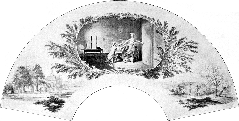 Geringere Ausbeute gewährt das Chodowieckiwerk dem Ornamentiker. Zwar entbehrt seine ornamentale Erfindung nicht der Zierlichkeit und Grazie, die dem „Zeitalter der Vignette“ durchweg eignet, aber wir treffen viel seltener selbständige dekorative Entwürfe unter seinen Radierungen, als etwa in den Werken der französischen Illustrationsstecher, deren Vignetten, Titelbordüren, Culs de lampes und Randleisten von liebenswürdigen Einfällen förmlich übersprudeln und oft ihren figürlichen Darstellungen überlegen sind. Chodowiecki beschränkt die Zierkunst auf die Rahmen kleiner Rundbilder und auf Titelkartuschen. Eine glatte Umfassung, die oben mit einer Bandschleife, einigen Blütenzweigen oder Emblemen belebt ist, genügt ihm meist für den erstgenannten Zweck (Abb. 185, 70, 94, 95, 115), seltener finden wir einen Frucht- oder Blumenkranz dazu verwendet. Seine Schlichtheit, seine Abneigung gegen pomphaften Apparat prägt sich auch in solchen Nebendingen aus. Reicher, aber mit ihren emblematischen Zuthaten nicht immer erfreulich, sind die Kalendertitel bedacht (Abb. 195). Strenge architektonische Stilisierung vermeidet er zu Gunsten naturalistischen Beiwerks, in dessen Anordnung sich zumeist ein geläuterter Geschmack bekundet (Abb. 28). Der Wertherfächer im Besitz von Frau Professor Koner in Berlin (Abb. 197), mit seinen landschaftlichen Beigaben (Abb. 196), mag als Zeugnis für die Begabung des Meisters auf kunstgewerblichem Gebiet an dieser Stelle erwähnt sein.