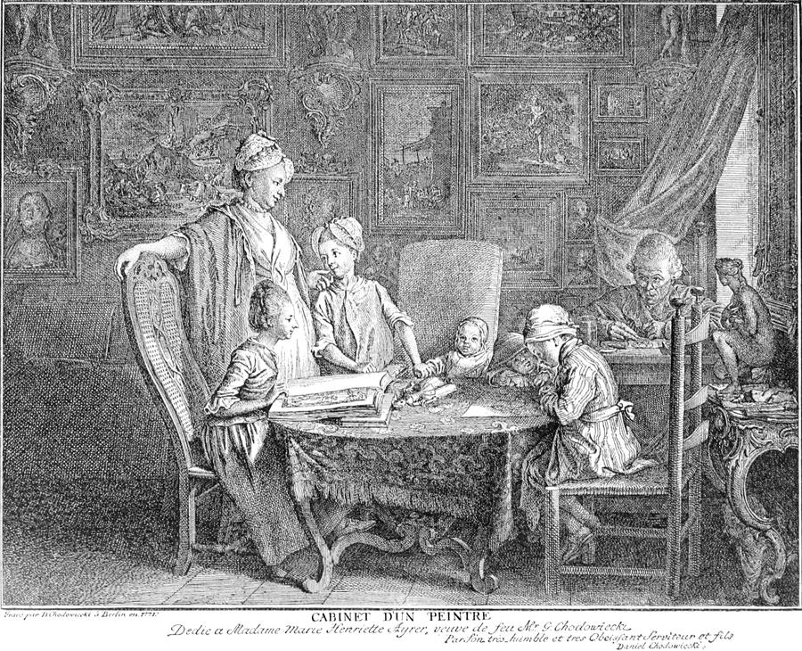 n meines Vaters Arbeitszimmer, dessen Wände zahlreiche Kupferstiche und Schabkunstblätter zierten, und das mir früh schon traulicher wurde als die Kinderspielstube, hing über einem Klapptisch, den altväterischer Hausrat, fridericianische Tabaksdosen, Zinnteller und Meerschaumpfeifen bedeckten, in schlichtem Mahagonirahmen eine Radierung, die sich meiner kindlichen Einbildungskraft besonders tief einprägte — wohl, weil sie gleich einem Spiegel das Behagen, das uns hier so oft umfing, verdoppelte: um einen runden Tisch drängen sich fünf Kinder; das älteste Mädchen beugt sich über einen großen schweinsledernen Band mit Kupferstichen, ihr gegenüber zeichnet ein etwa zehnjähriger Knabe eifrig, ohne sich von dem kleinen neugierig zudrängenden Brüderchen stören zu lassen, während die ältere Schwester für die Sorgfalt, mit der sie sich des Jüngsten annimmt, von der herantretenden Mutter mit dankbar liebevollem Blick belohnt wird. Diese zärtliche Gruppe hebt sich von dem halbdunklen Hintergrund des mit Kunstwerken überreich geschmückten Zimmers ab, in dessen einer Ecke am hohen, hellen Fenster der Familienvater vor einem kleinen Zeichentischchen sitzt und, den Pinsel in der Hand, scharf über die Brille weg zu den Seinen hinüberblickt. Das Blatt trug die Inschrift: „Cabinet d’un peintre“, doch da das Interesse für Bilder früher in mir wach war, als das Verständnis des Französischen, bat ich meinen Vater um eine Erklärung. Mit wachsender Teilnahme hörte ich, daß der Mann in der Ecke sich selbst und die Seinigen dargestellt habe just in dem Moment, wie er sie malte, daß er aus unserer Vaterstadt Danzig stamme und ein berühmter Kupferstecher gewesen sei.