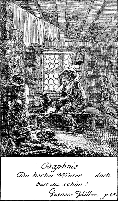 Bei den Illustrationen zu Romanen wählt unser Künstler keineswegs immer die dramatisch zugespitzten Wendepunkte der Erzählung aus, sondern die Vorgänge, die seiner Neigung zur Schilderung idyllischen Behagens am meisten zusagen. Wenigstens sind dies die gelungensten unter den zahllosen Romanbildern seiner Hand. Wie reizend mutet uns z. B. die Scene aus Pestalozzis Lienhard und Gertrud an, wo die letztere mit ihrem Jüngsten im Arm an den Schloßherrn herantritt, um sich über die Bedrückungen des Vogts Hummel zu beklagen (Abb. 187, E. 445, Zeichnung dazu), oder die Begrüßung von Lienhard und Gertrud im Hause des armen Käthners Rudi (Abb. 188, E. 455, Zeichnung dazu), das Titelkupfer zu Schummels Wilhelm von Blumenthal (E. 348) oder die[S. 126] lustige Episode aus Sternes empfindsamen Reisen (E. 464)! Das sind Genrebildchen von einer Einfachheit und zum Herzen sprechenden Wahrheit, die jeden litterarischen Kommentar entbehrlich machen.