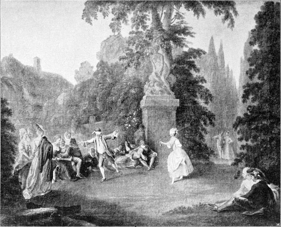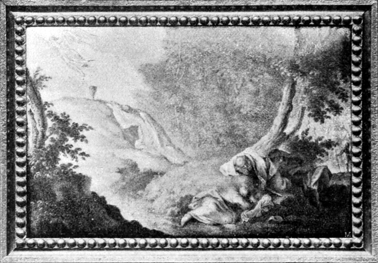 Seine ersten Versuche in der Ölmalerei fallen in das Jahr 1757. Trotz des fieberhaften Eifers, den er dieser Beschäftigung widmete, mußte er nur zu bald einsehen, daß seine Begabung ihn nach einer anderen Richtung wies. Das älteste uns erhaltene Ölbildchen seiner Hand — es war 1896 in der historischen Abteilung der Berliner internationalen Ausstellung unverbürgt als Travestie der biblischen Scene: Jakob bei Laban ankommend ausgestellt (Nr. 3395 des Katalogs) — ist zwar sehr charakteristisch[S. 17] in Zeichnung und Ausdruck der Köpfe, aber in der Farbe durchaus unerfreulich und verfehlt, ja geradezu unmalerisch. Es stellt novellistisch zugespitzt die Werbung eines plumpen alten Freiers um ein junges Mädchen dar, das ihre Gunst bereits einem jüngeren Liebhaber geschenkt zu haben scheint.