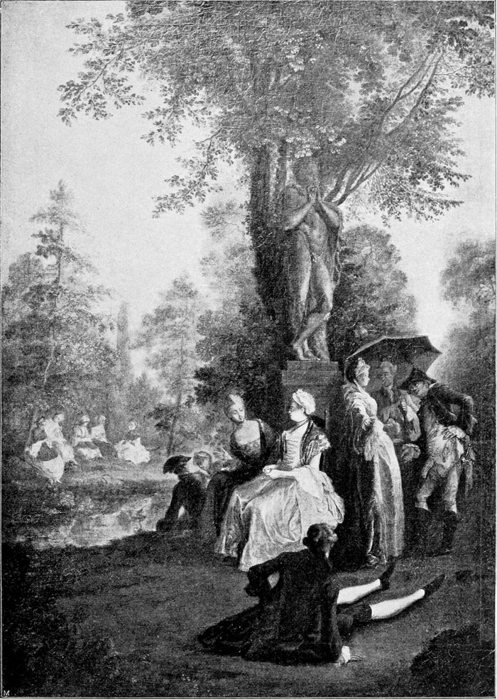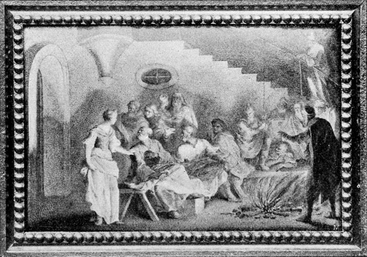 Ein Idyll aus der Patriarchenzeit, die dem Geschmack des Jahrhunderts, seiner Sehnsucht nach gefühlvoller Einfalt, Familienglück und Redlichkeit besonders zusagte, „Elieser und Rebekka“ — ebenfalls in den fünfziger Jahren entstanden — ist seither verschollen. Es wird kaum den späteren Ölbildern, von denen weiter unten die Rede sein soll, überlegen gewesen sein. Am besten[S. 18] gelangen Chodowiecki auch in dieser Technik die bürgerlichen Familienscenen, wie jene in silbrigem Gesamtton gehaltenen Genrebildchen bei Frau Dr. Ewald in Berlin, die uns eine Gesellschaft am Fenster und eine Lhombrepartie (datiert 1757, ausgestellt in Berlin 1896, Nr. 3389 und 3390 des Katalogs, Abb. 21 u. 22), vorführen, oder die kleinbürgerliche Wochenstube im Besitz eines Urenkels des Künstlers (Abb. 23) und das trauliche Interieur bei Kerzenlicht (Abb. 24). Hier sind die stillen Freuden des Privatlebens mit anheimelnder Intimität und überzeugender Wahrheit geschildert. Chodowiecki offenbart sich in ihnen als der unübertroffene Meister der „peinture familière et domestique.“