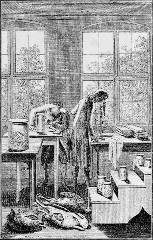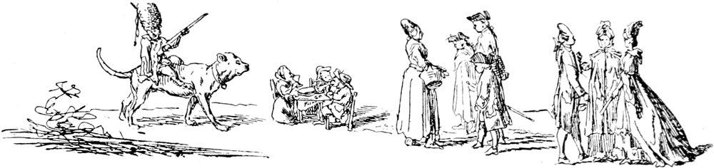 Besonderes Interesse verdient auch ein Versuch in Schabkunst, der zu den früheren und sehr seltenen Arbeiten des Meisters gehört (E. 20). Hier wurde die Kupferplatte mit dem Granierstahl aufgerauht und dann mit dem Schabeisen die Stellen, die im Abdruck hell erscheinen sollen, ausgeglättet, so daß sie keine Schwärze annehmen. Trotzdem dieser Versuch ganz gut gelang, hat Chodowiecki später fast niemals wieder diese Technik angewandt, und wir hören aus seinem Danziger Reisejournal, wie er sich bei dem Kupferstecher Deisch über die Einzelheiten dieses Verfahrens —[S. 99] freilich vergebens — näher zu informieren versuchte.