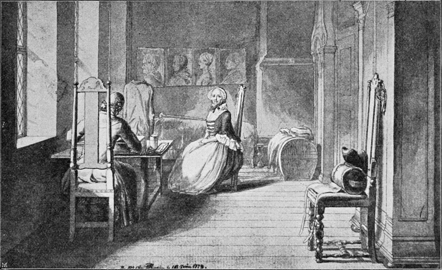 Chodowieckis Porträts sind von ungleichem Wert; viele von ihnen verdanken ihre Entstehung offenbar Aufträgen, die lediglich den Geschäftsmann, aber nicht den Künstler in ihm angingen. Mit staunenswerter Behendigkeit wußte er die wesentlichen Züge eines Kopfes in anscheinend sorgfältiger Röteltechnik auf das Papier zu bringen, wobei er, dem bequemen Vorbild eines Saint-Aubin u. a. folgend, die Profilstellung bevorzugte. Die charakteristische Umrißlinie mußte zur Ähnlichkeit das Beste thun, die Modellierung und Innenzeichnung wurde etwas flüchtiger abgethan, und die gleichmäßige Kreuzschraffierung[S. 115] des Hintergrundes sorgte für das plastische Hervortreten der Köpfe. Gewissenhaft gab er die Einzelheiten der weiblichen Coiffure wieder (Abb. 168, 175, 180), was sicherlich nicht wenig dazu beitrug, daß die Damen ihn gern als Verewiger ihres Exterieurs in Anspruch nahmen. Mit Stolz berichtet Johanna Schopenhauer, die Mutter des großen Philosophen, daß ihr als kleinem Kind das Glück wurde, von unserem Meister in Danzig porträtiert zu werden, und zahlreiche andere Damen der Danziger Gesellschaft waren eifersüchtig auf die Ehre, während seines Aufenthaltes in der Vaterstadt ihm zu einem Konterfey sitzen zu dürfen. Aus seinen eigenen Zeichnungen (Abb. 47) erfahren wir, wie es dabei zuging. Der Künstler rückte sich ein kleines Tischchen ans Fenster, um gutes Licht zu haben, setzte das Modell, nachdem die Vorhänge der übrigen Fenster herabgelassen waren, in passende Positur, und nun arbeitete er, der frühzeitig schon seiner Kurzsichtigkeit wegen sich einer Brille bediente, unter stetem Vergleichen und Hinüberblicken, an seiner Aufgabe. Der Miniaturmaler verleugnet sich nicht in der[S. 118] Art und Weise, wie er, dicht über das Blatt gebeugt, seine Zeichnung ausführt, und seine Kurzsichtigkeit erklärt uns die verkleinlichende Durcharbeitung der Einzelheiten, die ihm vielfach den Blick für das Ganze trübte. Nicht selten nahm Chodowiecki auch von den in Rötel gezeichneten Porträts, die übrigens meist in einem sehr viel größeren Maßstab gehalten sind, als seine radierten Bildnisse, einen Abklatsch in der Kupferdruckpresse, der sich durch Unklarheit der Linien, und, falls sich Schrift darauf befindet, durch die rückläufige Richtung derselben zu erkennen gibt.