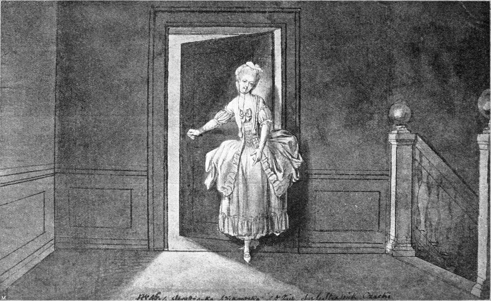 Sicher beglaubigte Arbeiten unseres Meisters aus dieser frühesten Zeit sind uns nicht erhalten bis auf eine getuschte Federzeichnung im Großherzoglichen Museum zu Weimar, die augenscheinlich auf einer Meßreise in Krakau entstanden ist und einen polnischen Volksgottesdienst darstellt. Sie trägt die Inschrift: „Ein polnisches Jubeljahr und Bus-Predigt, in Cracau gezeichnet 1750. D. Chodowiecky del(ineavit) Cracovia“ und ist, wie seine erste Danziger Zeichnung, Beweis dafür, daß der junge Geschäftsmann stets geneigt war, Vorgänge in seiner Umgebung, die irgendwie die Aufmerksamkeit zu fesseln vermochten, künstlerisch festzuhalten. Auch eine Folge von zweiundvierzig mit Feder und Tusche gezeichneten Illustrationen zu der Geschichte des Blaise Gaulard aus dem Jahre 1752 (im Besitze der Großherzogin Sophie von Sachsen) hat nur insofern Wert, als sie uns den ersten Versuch Chodwieckis auf dem Gebiete zeigt, dem er seinen Nachruhm vor allem verdankt: der Illustration.