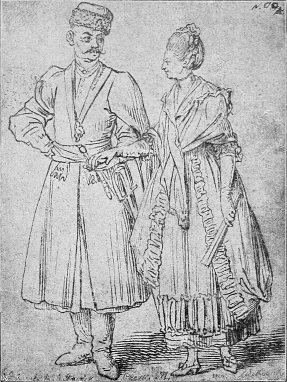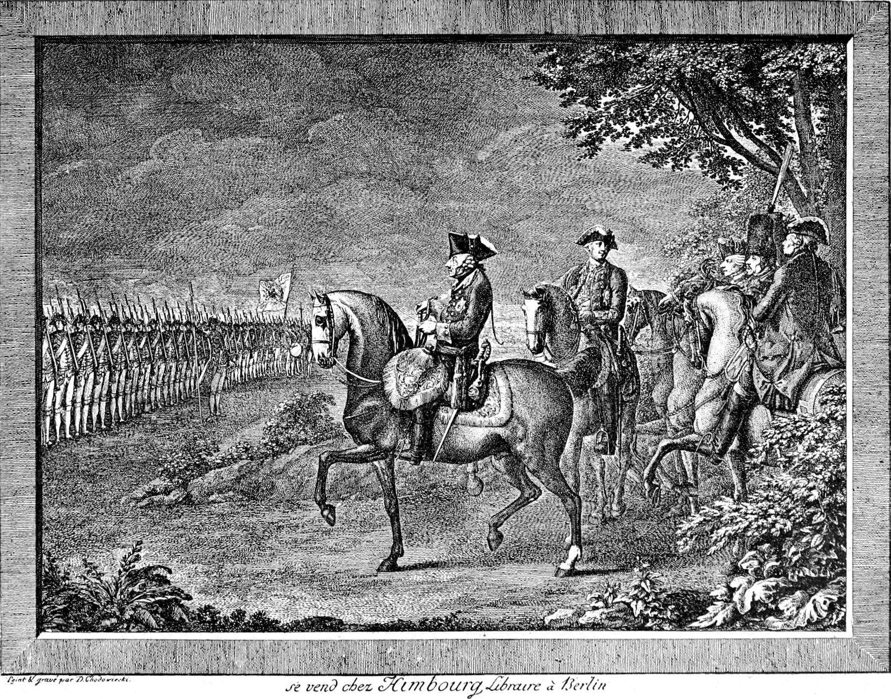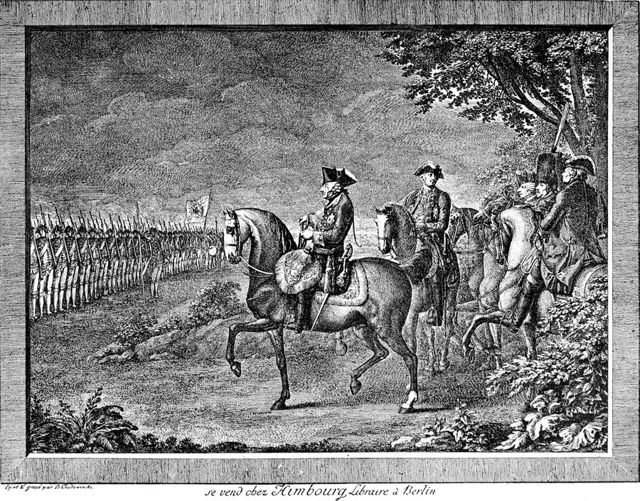 Als die ersten russischen Gefangenen 1758, von preußischem Militär eskortiert, durch Berlin zogen, erregte der Anblick der zerlumpten Gestalten nicht nur sein Mitgefühl, sondern auch seinen Darstellungstrieb. Mit seiner Gattin eilte er auf den Schloßplatz und verteilte Almosen und Liebesgaben an die halbverhungerten Krieger, die ihm zugleich als Modelle für eine Radierung dienten (E. 12). Ebenso fesselte das malerisch aufgeputzte Gefolge des türkischen Gesandten Achmet Effendi, der 1764 nach Berlin kam, lebhaft sein Interesse (E. 25, 43, 44).