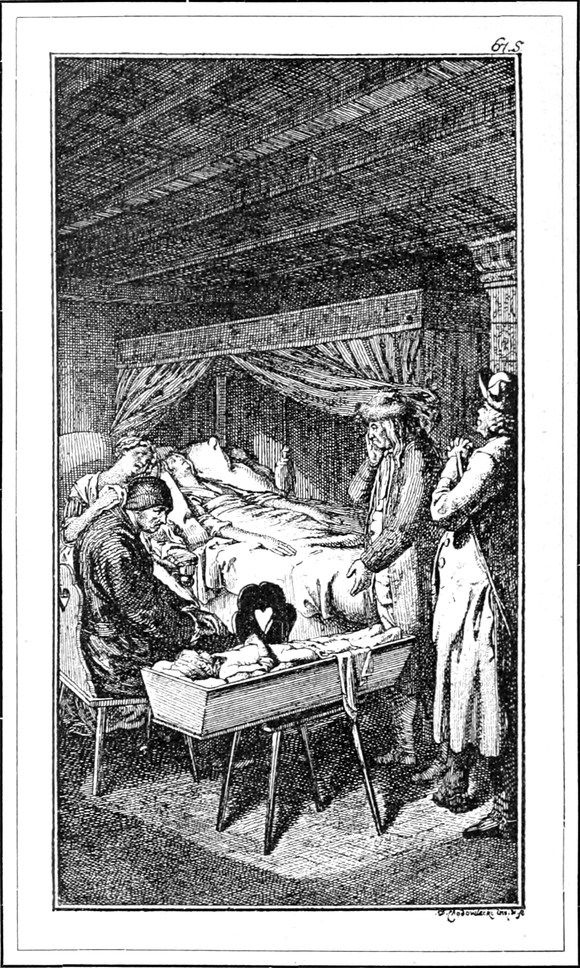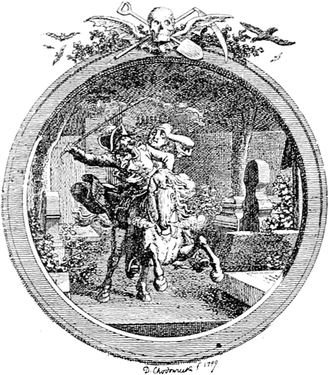 Daß wir all diesen mannigfachen Regungen der schöngeistigen Bewegung Deutschlands in Chodowieckis Kunst begegnen, erhöht den Reiz ihrer Betrachtung, und selbst da, wo die litterarische Fassung der Zeitideen für unser Empfinden bereits verblaßt ist, belebt ihr künstlerisches Spiegelbild unser nachfühlendes Interesse von neuem. Das naiv Menschliche in des Meisters Gestalten ist es, was uns immer von neuem anzieht und festhält. Wir beschäftigen uns mit ihnen, ohne weiter viel an die besondere litterarisch fixierte Situation zu denken. Und, wie es Menschen gibt, deren Liebenswürdigkeit uns die Trivialitäten überhören läßt, die sie vorbringen, so kann man auch Chodowiecki nicht böse sein, wenn er gelegentlich ins Platte verfällt. Sicherlich wäre er selbst der letzte gewesen, der sich beleidigt gefühlt hätte, wenn man das, was er ernst gemeint, einmal komisch fand. So wird es Manchem wohl schwer werden, das Erdbeben in Calabrien (E. 614) oder den Heldentod Schwerins (E. 567) in Chodowieckis Darstellung tragisch zu nehmen, selbst der Tod Friedrich des Einzigen (Abb. 96, E. 614) oder des Fürsten Potemkin (Abb. 184, E. 689) haben etwas ungewollt Komisches, wie nicht minder die Ohnmacht Heloisens (E. 535, Abb. 83) und der Raub der Helena (E. 731). Hier unterliegt seine Gestaltungskraft durchaus der Beschränktheit zeitgenössischer Auffassung.
