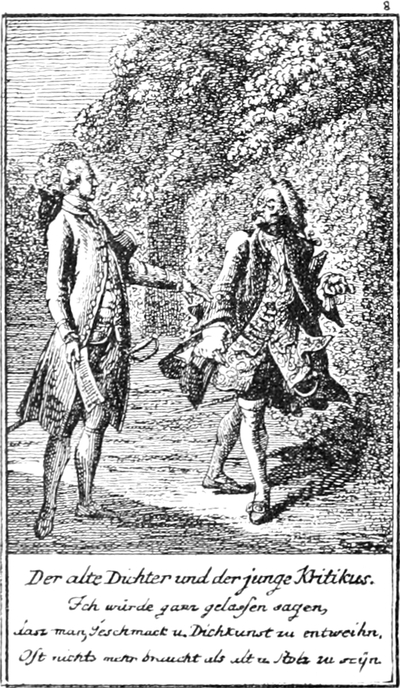 Vor dem Auftreten unserer großen Klassiker hielt Kritik und verständige Nüchternheit die freie Produktion Deutschlands in engen Schranken. Lehrhafte Neigung überwog; Fabel und Parabel bildeten die beliebteste Gattung der Poesie. Erst durch Lessings Auftreten wurde Berlin zum Mittelpunkt geistiger Regsamkeit. Obzwar Chodowiecki in manchen Zügen Wahlverwandtschaft mit dem Dichter der Minna von Barnhelm verbindet, der gleich ihm das deutsche Bürgerleben für die Kunst entdeckt hat, wäre es doch verwegen, ihn etwa den Lessing der Malerei zu nennen. Wohl aber spüren wir in seinem Wesen und seiner Auffassung der Dinge, die um ihn her geschehen, Etwas von der kindlichen Naivetät des Wandsbecker Boten Claudius, dem Witz Hippels, der Innigkeit Pestalozzis, der Satire Lichtenbergs, Etwas von Matthissons Sentimentalität, Ifflands theatralischem Geschick, Nicolais und Johann Jacob Engels Nüchternheit, Krummachers Gemütseinfalt und Seumes männlicher Art, und all das nicht in widerspruchsvollem Nebeneinander, wie etwa bei Lavater, sondern in ausgeglichener Mischung als Ausdruck einer anpassungsfähigen und doch kernhaften Natur. Auch die Werke der älteren Dichtergeneration bringen einzelne Saiten seines Ichs zum Mitschwingen. Gewinnen auch Hagedorns tändelnde Anakreontik und Gottscheds Franzosenkultus keine ausgeprägte Gestalt in seinen[S. 124] Werken, so gemahnt uns Vieles bei ihm an Rabeners bürgerliche Satire, Gellerts Klarheit und Biedersinn, Pfeffels Humanität und Gleims patriotisches Pflichtbewußtsein.
