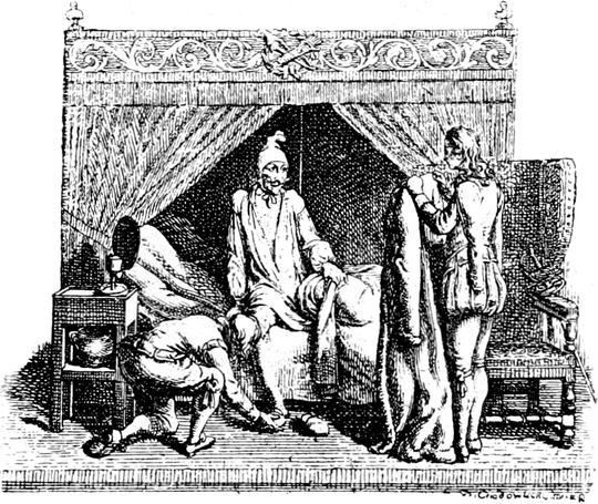 Wo der Text Witz oder Humor verlangt, steht Chodowiecki meist seinen Mann. Wenn auch Cervantes’ Don Quixote und Le Sages Gil Blas (E. 285) nicht eben Stoffe waren, die ihn zu besonders glücklichen Leistungen anregen konnten, so gelang ihm dafür um so besser die Travestie Blumauers mit ihrer spießbürgerlichen Komik (Abb. 193), die Verspottung trottelhafter Beschränktheit und Einfaltspinselei, wie sie in Nicolais Sebaldus Nothanker (Abb. 59, E. 131, 132, 104), in Müllers Siegfried von Lindenberg, — dem die köstliche Liebhaberaufführung von Lessings Minna entlehnt ist (Abb. 85, E. 490) —[S. 127] und in dem komischen Roman Philipp von Freudenthal (Abb. 89, E. 390) so köstlich gegeißelt werden, sowie die gutmütige Satire in Gellerts Fabeln (Abb. 6265, E. 141, 160). Unwiderstehlich komisch wirkt das starre Entsetzen der vettelhaften Meta aus der „Geschichte eines Genies“ beim Anblick der Untreue ihres geliebten Syrup (Abb. 192, E. 346). Aber auch ernste Empfindungen, leidenschaftlichen Schmerz, herzbewegende Trauer bringt die Radiernadel des Meisters oft zu wirksamem Ausdruck, wenn das Milieu des bürgerlichen Standes, der ihm von Jugend auf vertraut war, mit dem er fühlte und dachte, gewahrt bleibt. So ergreifen uns die Sterbescenen aus Sebaldus Nothanker (Abb. 57, E. 102) und Hippels Lebensläufen (Abb. 77, E. 302) durch ihr echtes Gefühl, wenn sie auch der mattherzigen Rührseligkeit der Zeit etwelchen[S. 128] Tribut zollen. Einzelheiten des Ausdrucks in der Haltung und den liebevoll durchgeführten winzigen Gesichtern fallen dabei mehr ins Gewicht, als die Gesamtstimmung, die er den Interieursscenen zu geben versucht. Es sind eben — aber- und abermals muß es betont werden — die sympathischen Grundzüge in Chodowieckis Wesen, seine Ehrlichkeit und sein Kindergemüt, die selbst aus einer geschmacklosen Fassung mit dem Glanz echten Edelgesteins hervorleuchten. Daß die Schilderung der harmlosen und innigen Freuden bürgerlichen Familienglückes am stärksten solche Vorzüge erkennen läßt, dürfen wir auch an dieser Stelle nicht unwiederholt lassen (Abb. 2, 108, 110). Schon aus diesem Grunde und zugleich seiner kulturgeschichtlichen Bedeutung wegen wird Chodowieckis „Weihnachtsabend“ in Langs Almanach von 1799 (Abb. 194, E. 851) stets einen besonderen Reiz auf den Beschauer ausüben. Bildet doch diese kleine Radierung einen der wenigen Belege dafür, daß die für unser Gefühl mit der Weihnachtsfeier so unzertrennlich verbundene Sitte der Ausschmückung eines Tannenbaums am Ende des vorigen Jahrhunderts in Deutschland noch keineswegs allgemein eingebürgert war; wir sehen hier vielmehr ein hölzernes oder metallenes Gestell zur Aufnahme des Lichter- und Geschenkschmucks auf dem Gabentisch errichtet,[S. 129] zu dem die Eltern ihre jubelnden Kleinen führen. Solch ein Beispiel erinnert uns von neuem daran, daß Chodowieckis Darstellungen eine unerschöpfliche Fundgrube für den Kulturhistoriker bilden, wie sie denn von dem bedeutendsten Schilderer fridericianischer Zeit in diesem Jahrhundert, von Adolf Menzel, der in mehr als einer Beziehung auf unseres Meisters Schultern steht und lebhafte Verehrung für seinen großen Vorläufer hegt, mit Vorliebe benutzt worden sind.