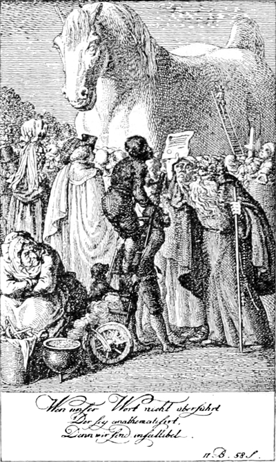 Trotz seiner starken Religiosität, die er 1799 gegen den freidenkerischen Nicolai in einem längeren Aufsatz verteidigte, glauben wir aus seinen biblischen Kompositionen[S. 112] herauszufühlen, daß ihm ein innerliches Verhältnis zu diesen Dingen abging, daß ihm das Bedürfnis fehlte, durch seine Kunstsprache die Gläubigen zu erbauen oder zu eigener Auffassung zu bekehren. Dafür spricht schon die auffallend kleine Zahl von religiösen Darstellungen, die sich in seinem Werk finden. Auch darin erkennen wir seine nie verleugnete Ehrlichkeit wieder. Zu den Fragen, die in der Aufklärungsepoche so viele Gemüter leidenschaftlich erhitzten, nahm er einen versöhnlichen Standpunkt ein, wie er sich ausspricht in den folgenden Worten des eben erwähnten Schreibens an Nicolai: „Kein Freydenker ist verwünschenswerth, aber zu beklagen ist ein jeder, der es ist, und man muß sich wohl hüten, keinem Gelegenheit zu geben, es zu werden.“