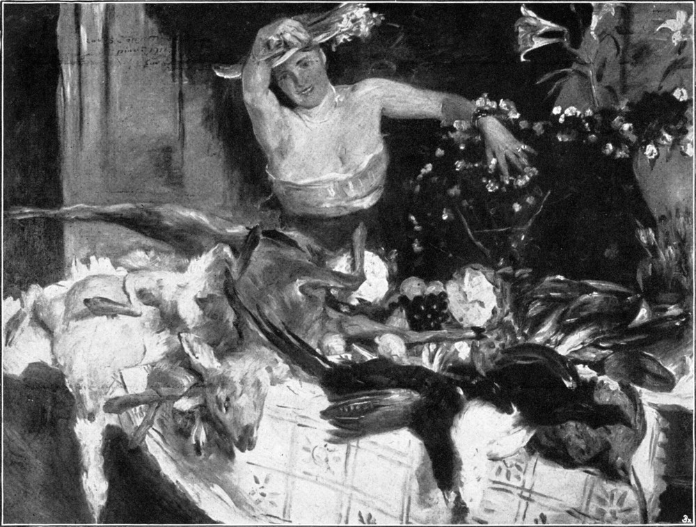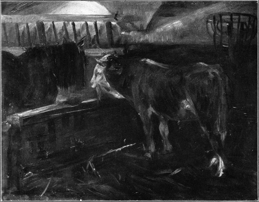 Aber er machte sich wenig daraus, da sein Innerstes voller Ideen steckte. Und obwohl er all seinen Kameraden an Können weit überlegen war, nahm er doch den Akademiebetrieb nicht sonderlich ernst. Gern verbrachte er seine Zeit bei einem seiner Verwandten, einem Fleischermeister, der ihn oft mit ins Schlachthaus nahm, wo der angehende Künstler trotz dem Unwillen der hier beschäftigten Leute gern malte. Ist auch aus dieser frühen Zeit von solchen Bildern nichts erhalten, so wird man doch diese Eindrücke nicht gering veranschlagen, da Corinth[S. 31] später oftmals und gern die Fleischerläden gemalt hat, die ihn malerisch ebenso lockten wie Rembrandt oder Ostade die Erscheinung eines aufgespannten toten Ochsen. Ja, man kann sogar weiter gehen und behaupten, daß in der Art, wie Corinth schon in diesen akademischen Lehrjahren unbewußt das Leben überall an seinen ursprünglichen Punkten aufsucht, vorgreifend ein Teil seiner späteren künstlerischen Entwicklung angedeutet ist.