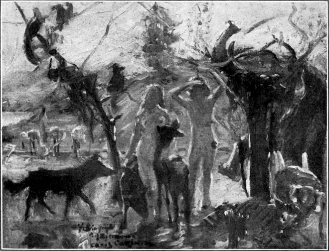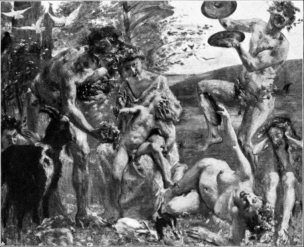 In dem lustigen „Bacchanale“ vom Jahre 1896 dagegen, das einstmals in München, für uns heute unbegreiflich, abgelehnt wurde, enthüllt sich das Dionysische heiterer Lebenskunst, mythologisch verklärt, in reinster Form (Abb. 26). Botticellische Frühlingsstimmung paart sich auf diesem Bilde mit dem tanzfrohen Rhythmus bewegter Gestalten. Derbe Sinnenfreudigkeit sucht einen Gleichklang in der blumensprießenden Landschaft. Ein dekorativer Zug beherrscht die Komposition, der später nur selten ähnlich begegnet. Diesem Werke nahe verwandt ist die auf eine ähnliche Note gestimmte „Geburt der Venus“, die vielleicht in noch höherem Maße die Erinnerung an den genannten Meister des ausgehenden Florentiner Quattrocento wachruft (Abb. 28). Vielleicht darf man in diesem Bilde auch entfernt Böcklinsche Reminiszenzen vermuten, obwohl man gerade dieses Meisters Einfluß sonst bei Corinth am wenigsten feststellen kann; das Verlangen nach dekorativer Wirkung ist auch hier unverkennbar.